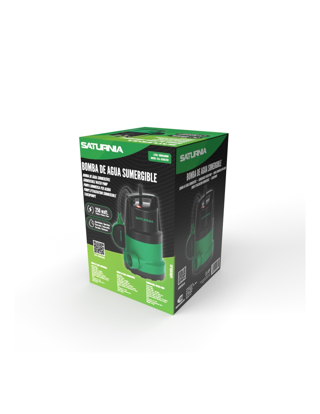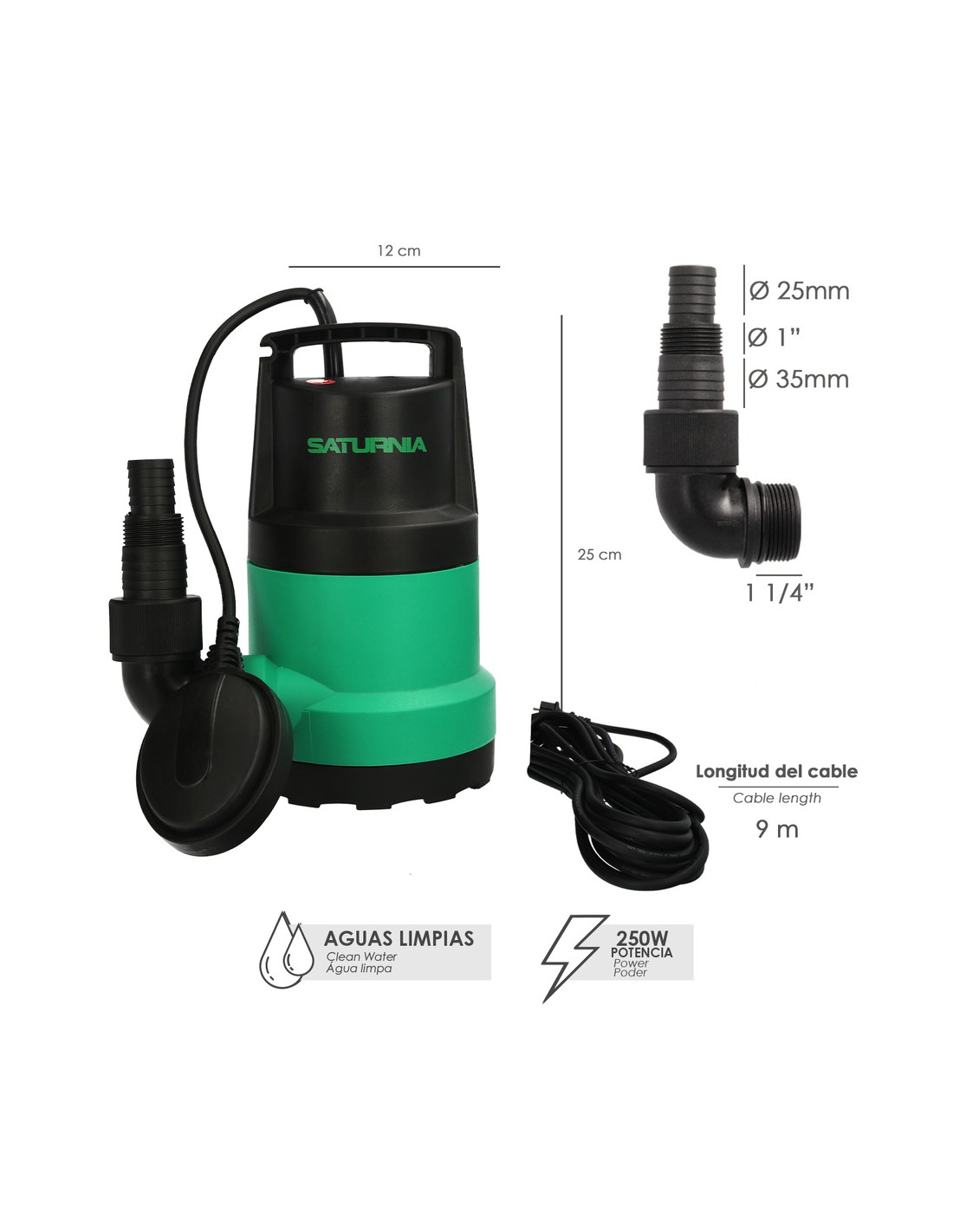 - Potencia: 250 Watt. Con flotador de activación del agua, permite que la bomba se active y desactive según el nivel del agua. Indicada para aguas limpias.