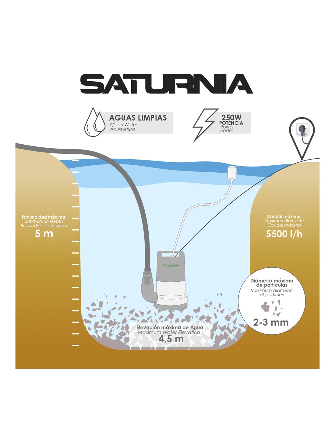 - Elevación maxima de agua: 4,5 metros. Diámetro máximo de partículas: 2-3 mm. Altura de aspiración minima: 10 cm.