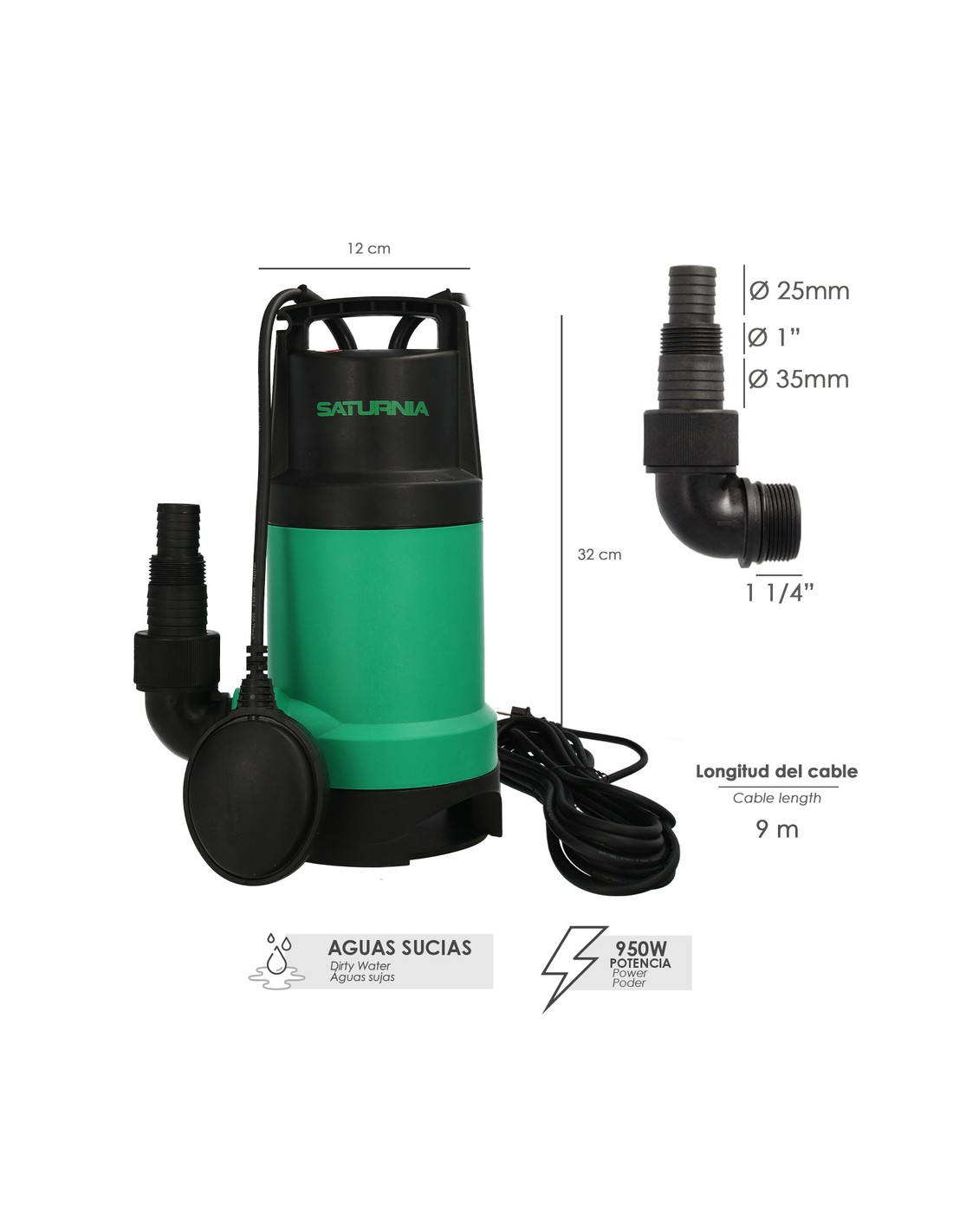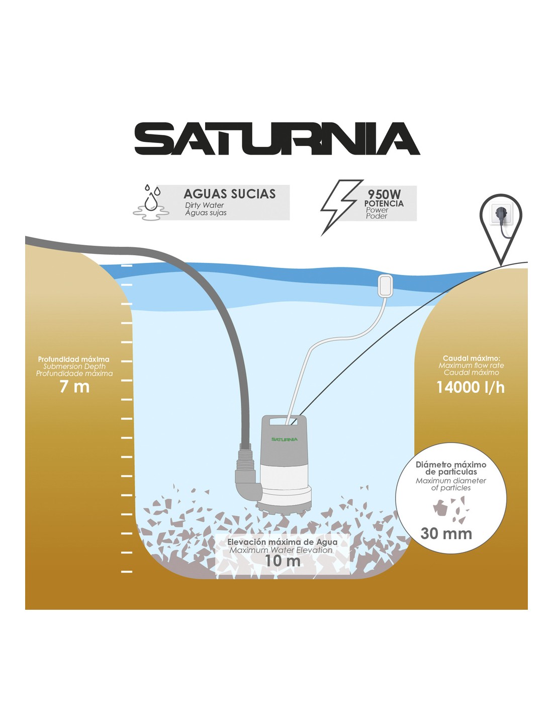Bomba Aguas Sucias Sumergible 950 W. 14.000 lts/hora, Profundidad 7 Mts, Elevación 10 mts. Particulas max. Ø 30 mm.