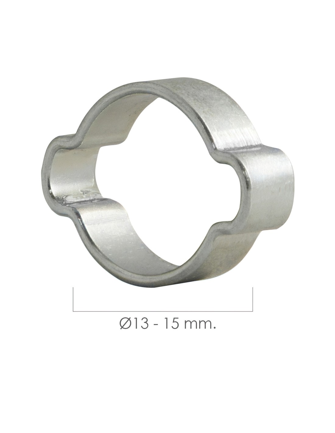 Abrazadera dos orejas - Medida cerrada / abierta: Ø 13 / 15 mm. - Realizada en metal. - Ideal para fijaciones de las gomas a tubos. - Bordes redondeados para no dañar el elemento fijado.