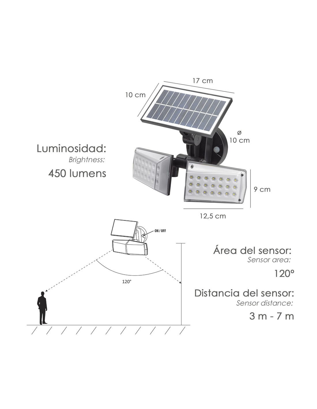 - Area del sensor de movimiento: 120º / 3-7 metros.