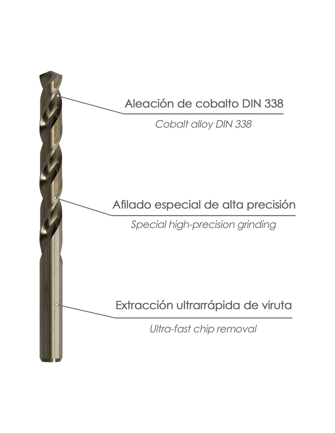 - Fabricada en aleciaón de HHS y coblato garantiza una durabilidad mayor que las brocas convencionales, así como una superior capacidad de corte, durabilidad y resistencia.