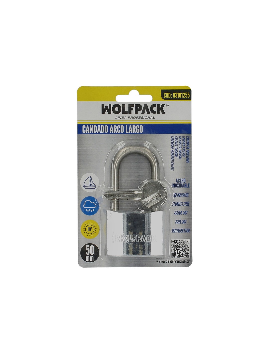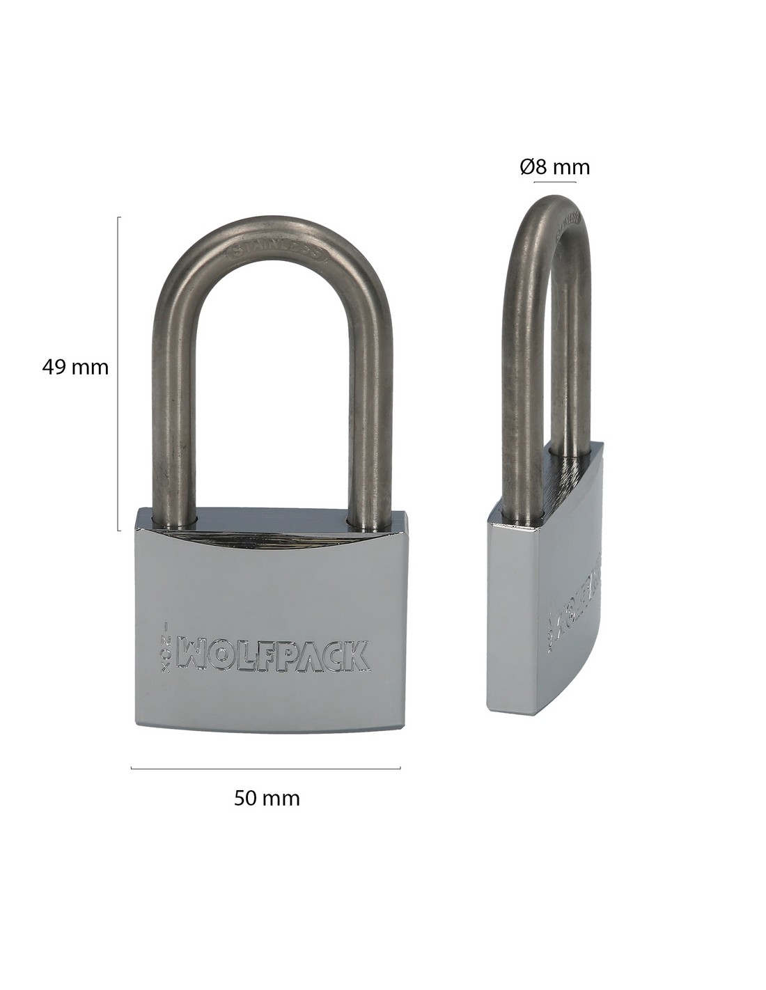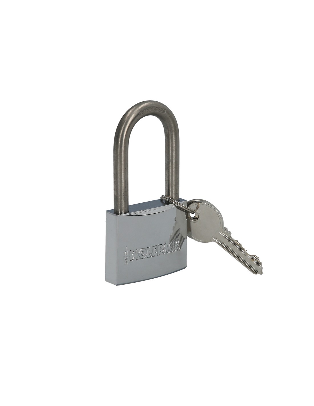 Candado inoxidable. - Arco largo. - Medida: 50 mm. - Realizado en acero inoxidable. - Doble cierre. - Incluye 2 llaves. - La llave se puede copiar con la IS-1D