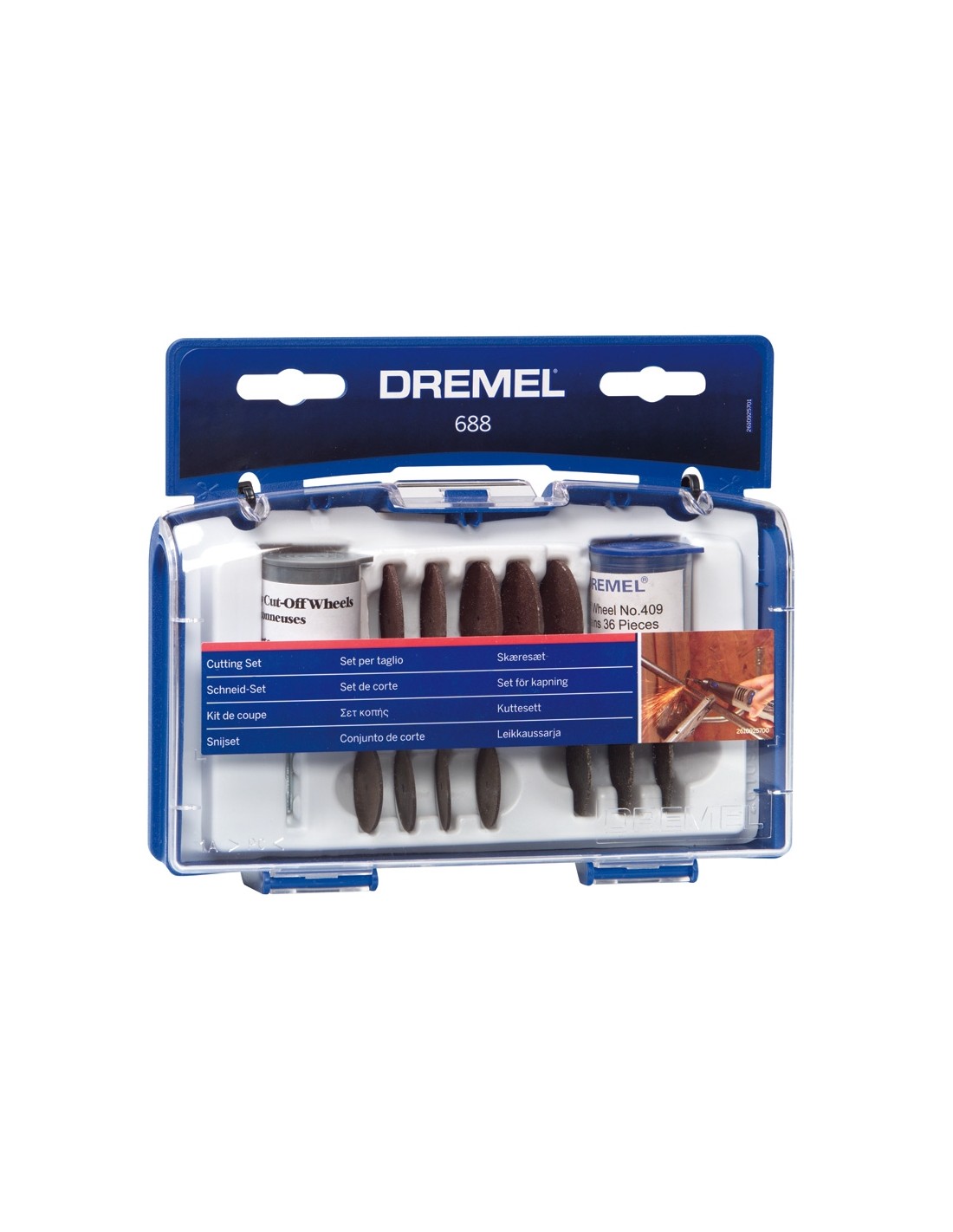 Selección de 68 discos de corte presentados en un práctico maletín. Los 3 separadores incluidos permiten guardar los accesorios de forma óptima. La guía de inicio rápida de Dremel ofrece información sobre los accesorios incluidos.