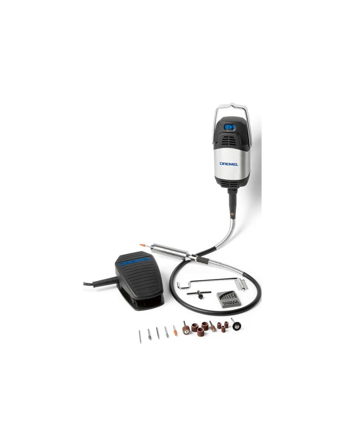 Su potente motor (300 W) ofrece un par elevado a velocidades bajas. La empuñadura de precisión se ha diseñado para ofrecer control y comodidad, incluso en usos prolongados. Eje flexible para trabajos exigentes que incluye un sistema patentado de cojinetes para aumentar la durabilidad y ofrecer un funcionamiento óptimo. El pedal de velocidad variable permite ajustar la velocidad según la aplicación sin usar las manos. La empuñadura intercambiable es compatible con otras herramientas de eje flexible. Puede usarse con todos los accesorios de las multiherramientas Dremel.