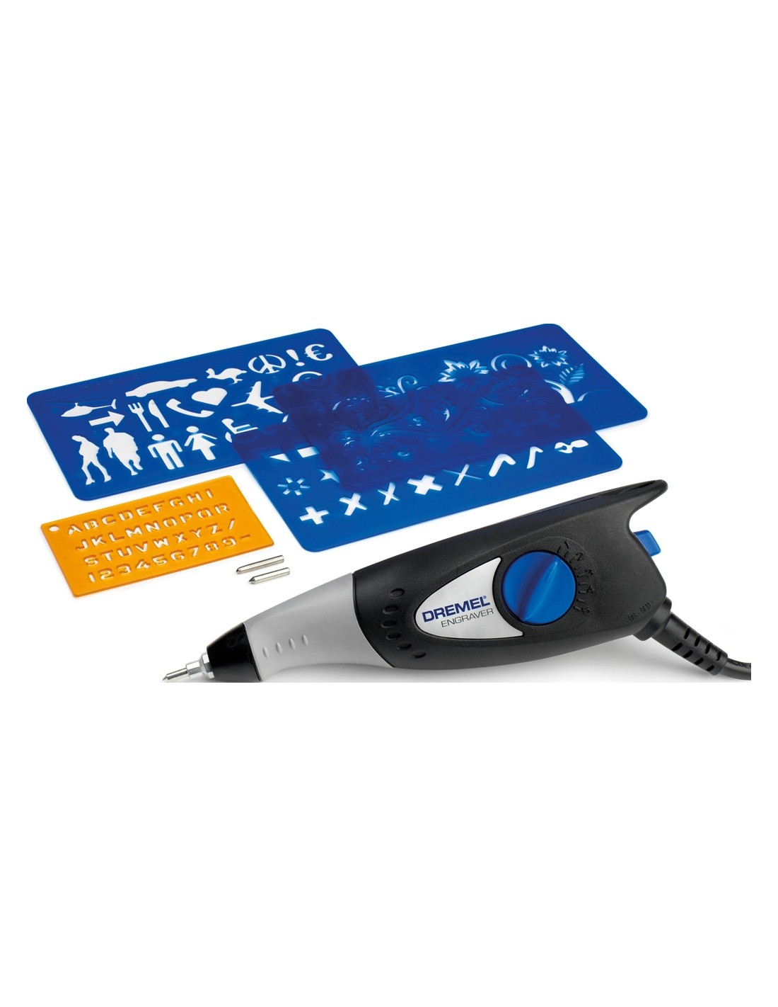 Varios efectos posibles: el control de profundidad de trabajo es variable y permite grabar tanto líneas finas como ranuras profundas Trabaje y grabe una gran variedad de materiales con las puntas de carburo reemplazables y la punta de grabado de diamante Confort para los proyectos de artesanía incluso en operaciones prolongadas gracias a su empuñadura suave y diseño ligero Comience a crear sus propios diseños utilizando ayuda para el grabado: se incluyen plantillas para grabar letras, números y símbolos con precisión