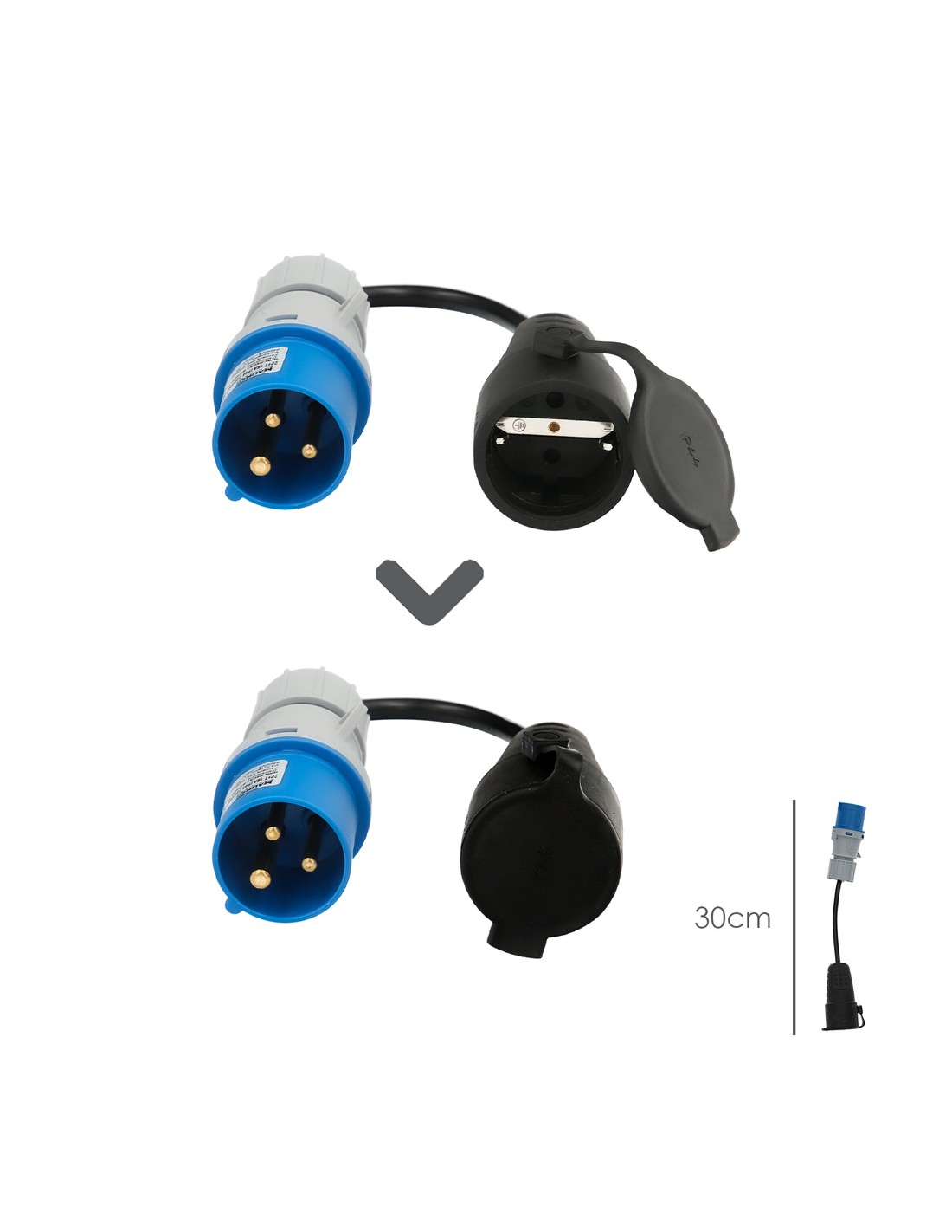 - Adaptador de clavija CEE a Schuko, 2 polos + Tierra. Max. 16A. 230V.
