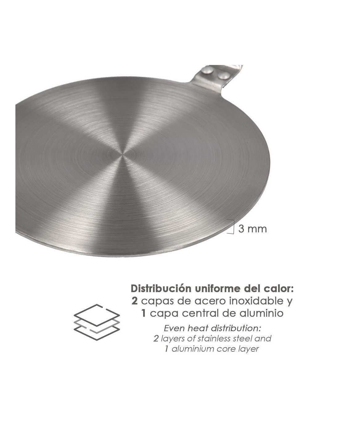 - Fabricado en 3 capas, 2 exteriores de acero inoxidable y una central de aluminio.
