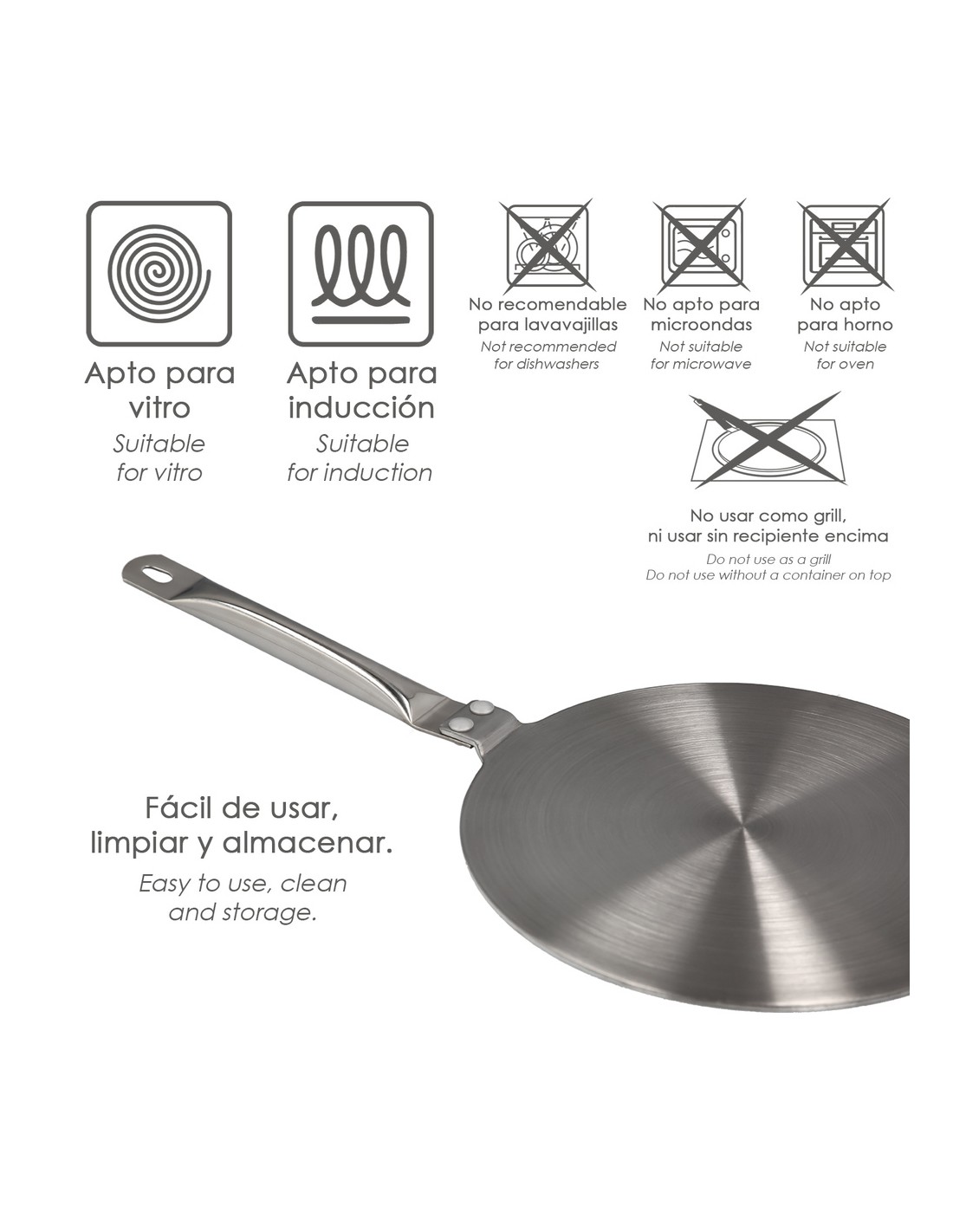 - No se debe usar como grill, ni usar sin recipientes encima, ni introducir en el lavavajillas. No apto para microondas ni horno.