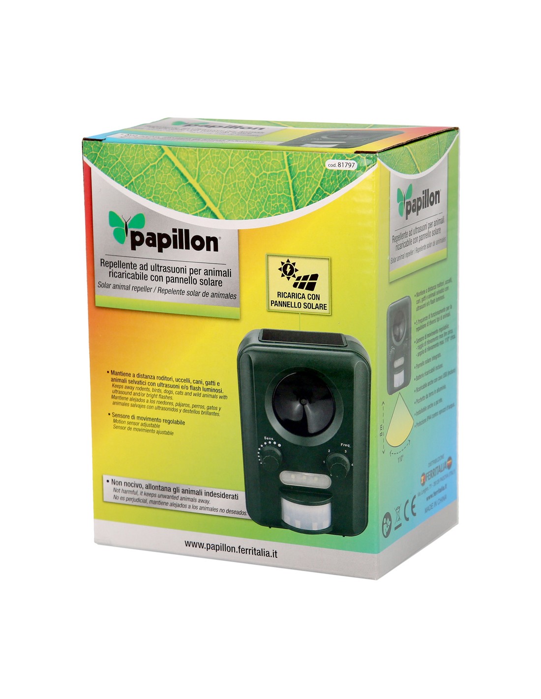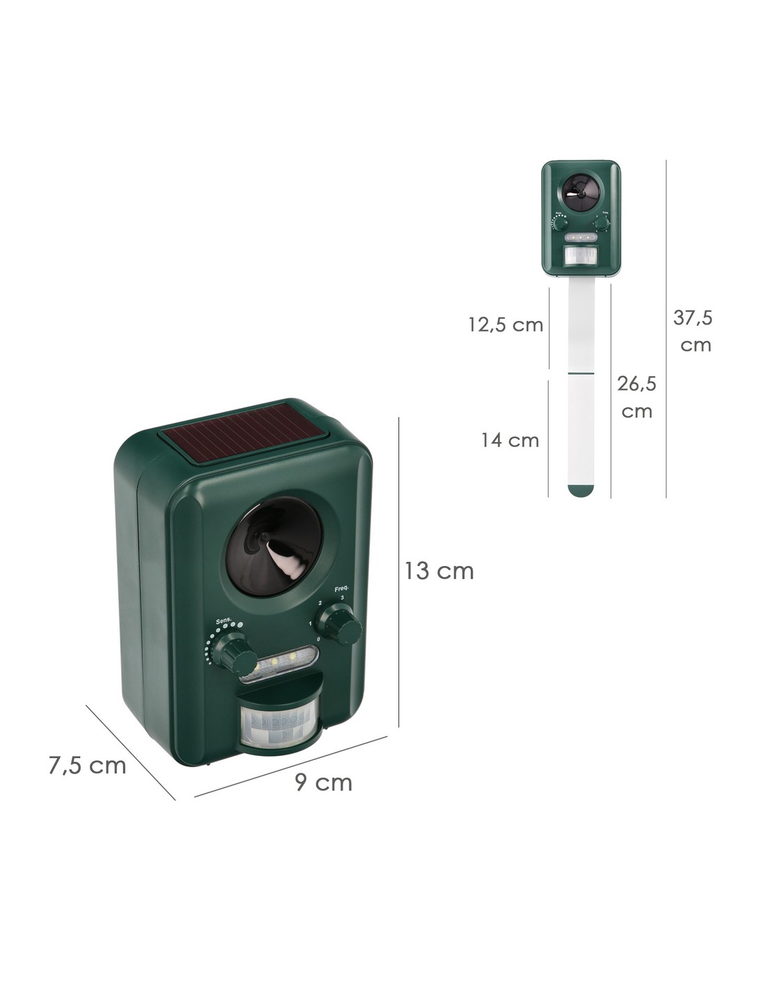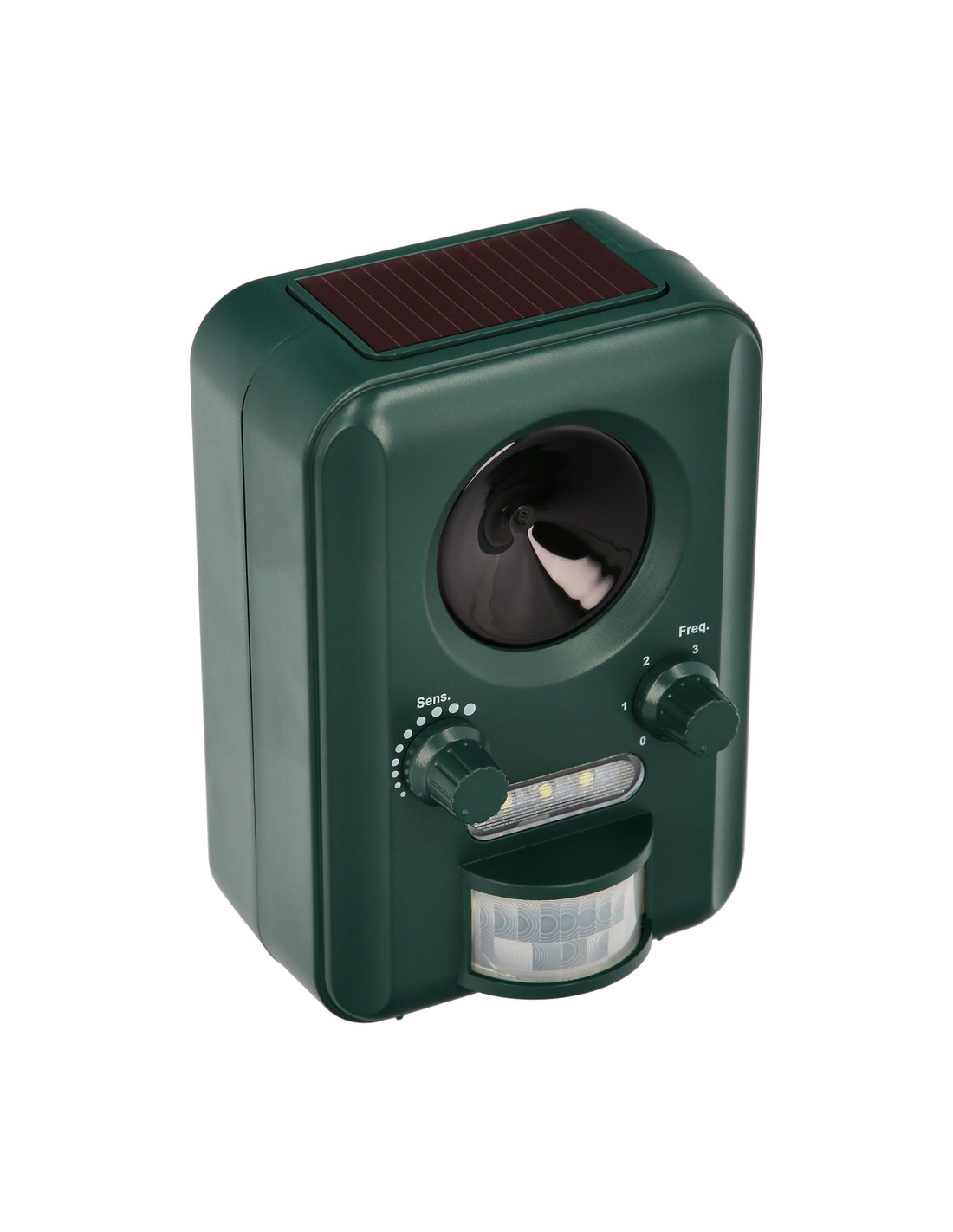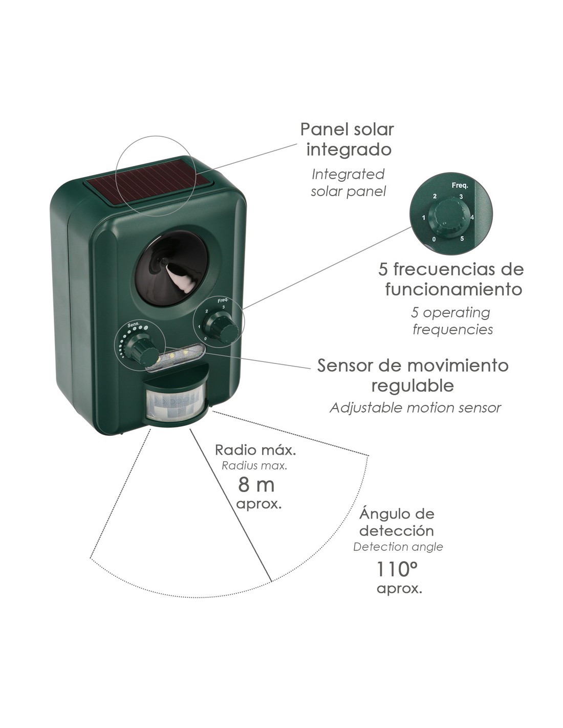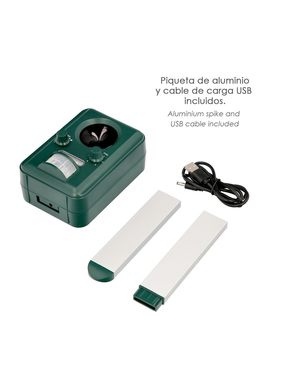 - Mantiene alejados a roedores, pajaros, perros, gatos y animales salvajes con ultrasonidos y destellos de luz.