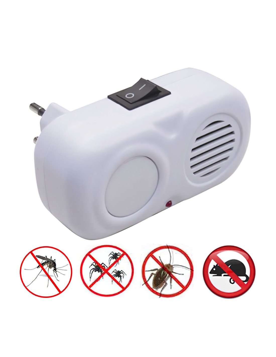 Ahuyentador ultrasonidos universal. - Radio de acción: 60 m². - Auyenta insectos como mosquitos, arañas, cucarachas, etc. - Con boton de encendido y apagado. - Articulo también conocido como: repele mosquistos, repelente insectos.