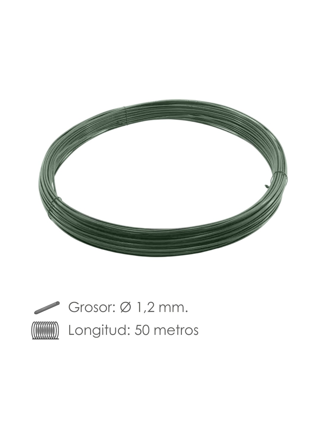 Carrete alambre Maurer. - Plastificado. - Medida: 1,2 mm. - Color Verde. - Rollo 50 metros. - Articulo también conocido como alambre tendedero, alambre tender. - Este alambre NO ES INOXIDABLE PUEDE OXIDARSE.