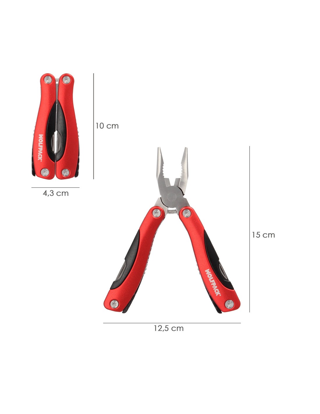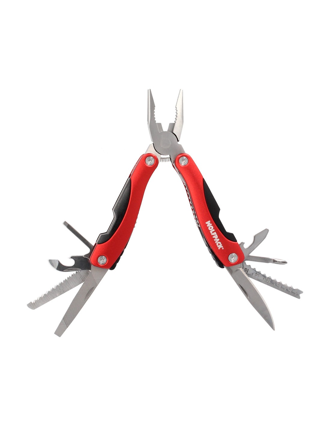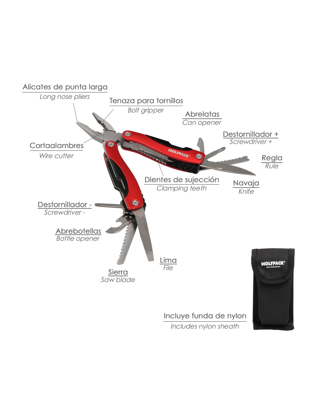 - Esta herramienta multifunción cuenta con alicates punta larga con muelle, tenaza para tornillos, corta alambres, abrelatas, destonillador estrella, regla, navaja, lima, sierra, abrebotellas y destornillador plano.