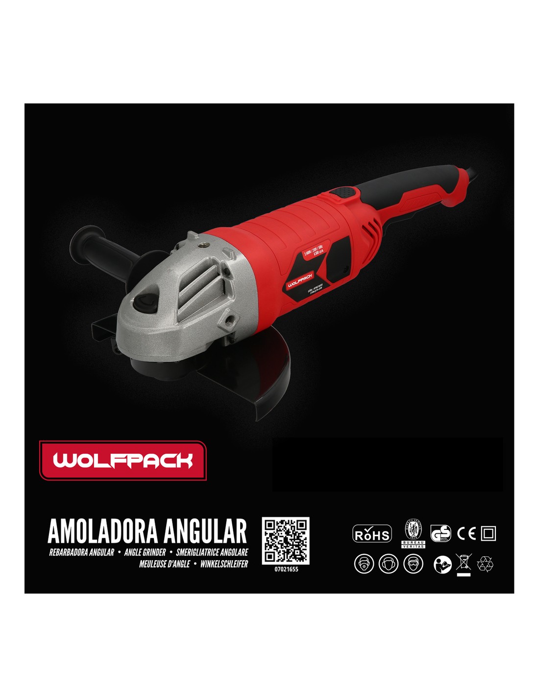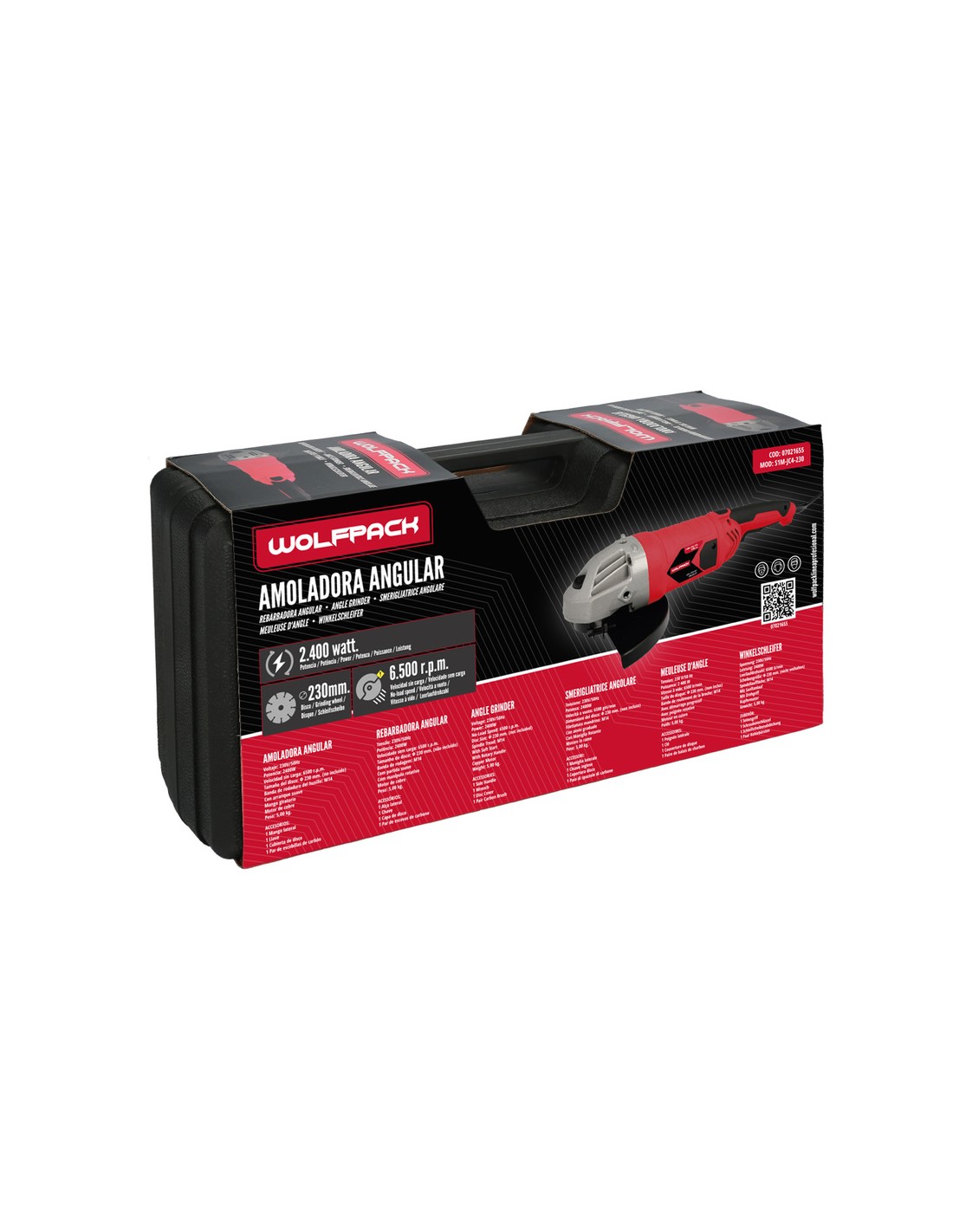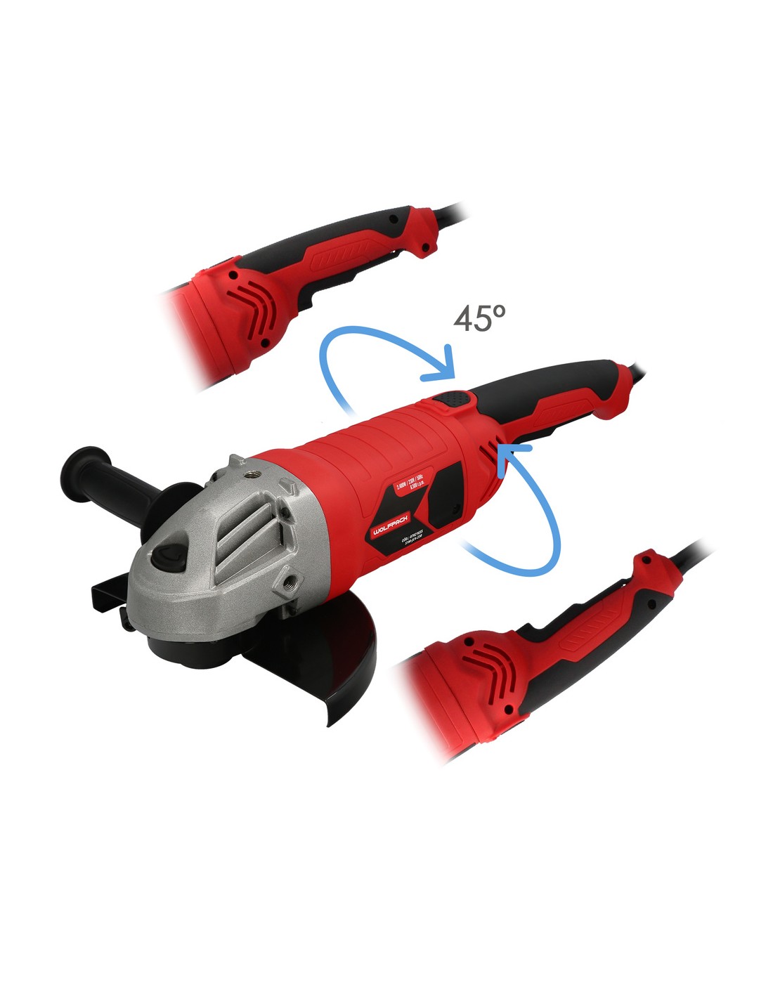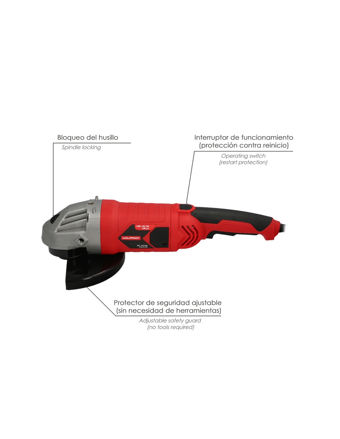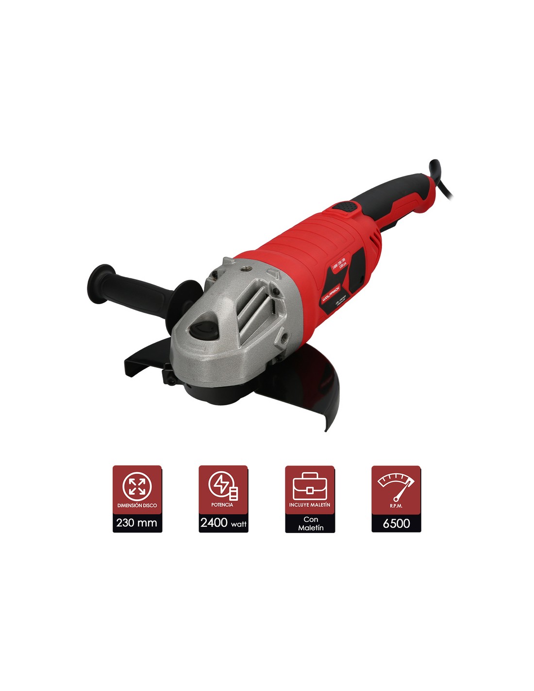 Amoladora Angular 2.400 Watt. Disco Ø 230 mm. 6.500 R.P.M. Mango 3 Posiciones Eje M14 Protector Disco Ajustable, Anti arranque