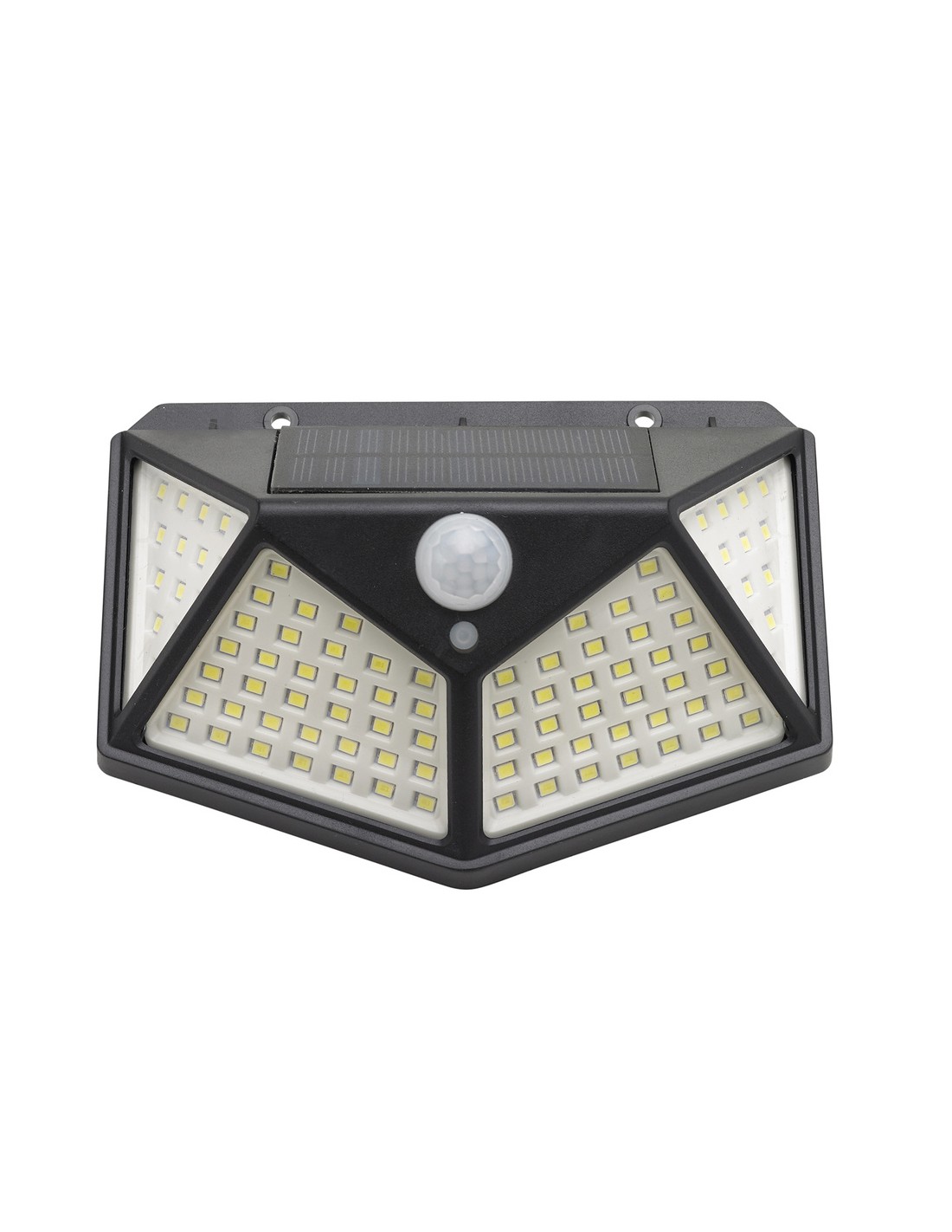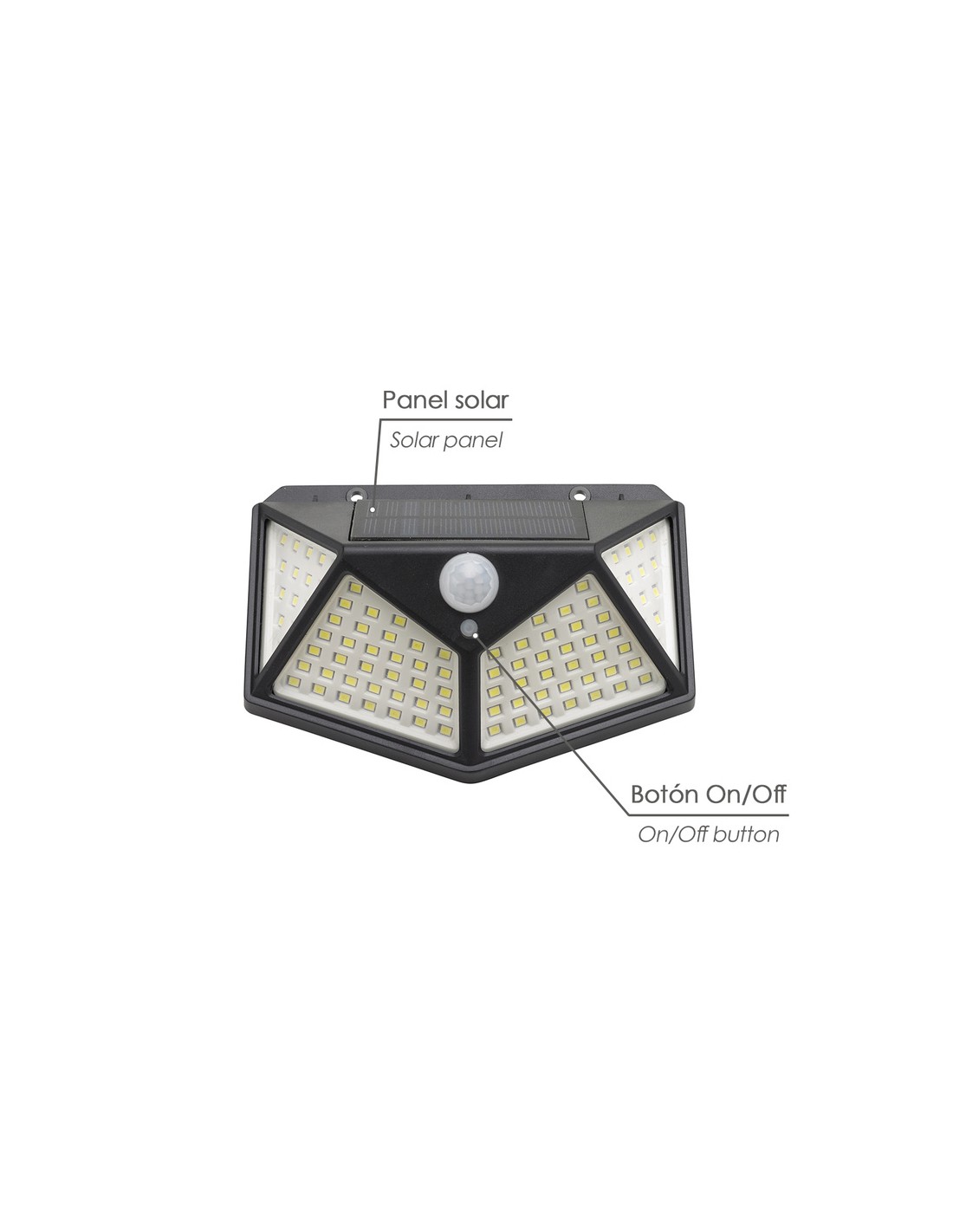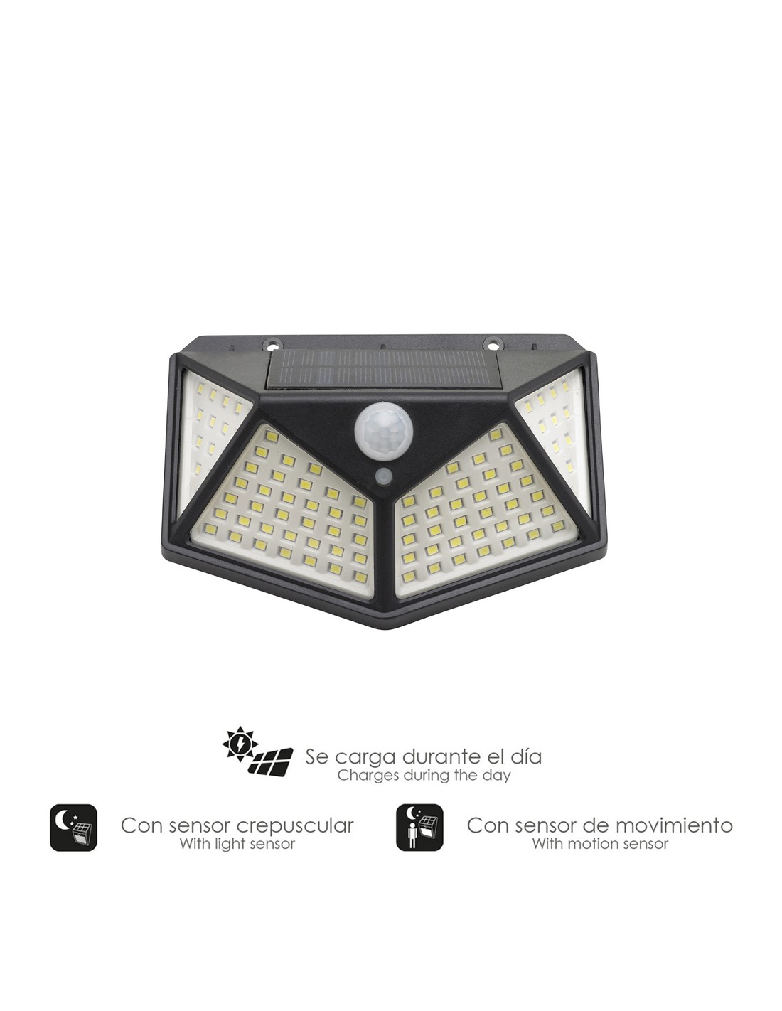 - Aplique exterior con batería de carga solar de 270 lumenes de potencia lumínica, encendido y apagado automático mediante sensor de movimiento.