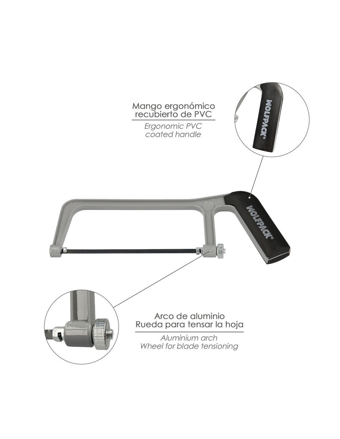 - Con rueda ranurada para tensar la hoja.