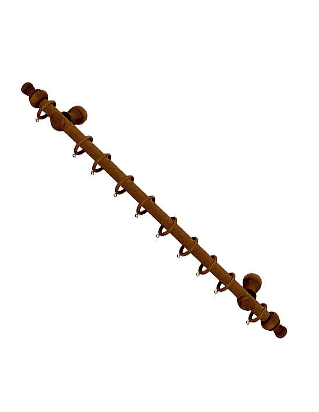Riel madera completo - Acabado: nogal - Longitud x diámetro: 1,20 metros x 12 mm. - Incluye terminales, 10 anillas por metro y 2 soportes. - Ideal para el montaje de cortinas. - Articulo tambien conocido como , barra cortina, tubo cortina.
