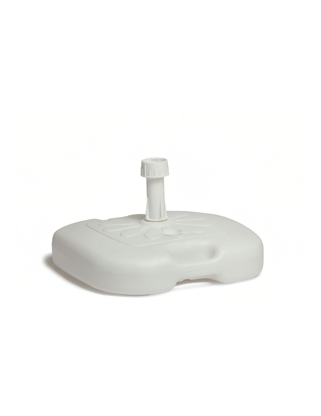 Base sombrilla Abs color blanco. - Capacidad: 20 litros. - Color blanco. - Con asa para facilitar su transporte. - Se puede rellenar con agua o arena. - Peso 850 gramos.