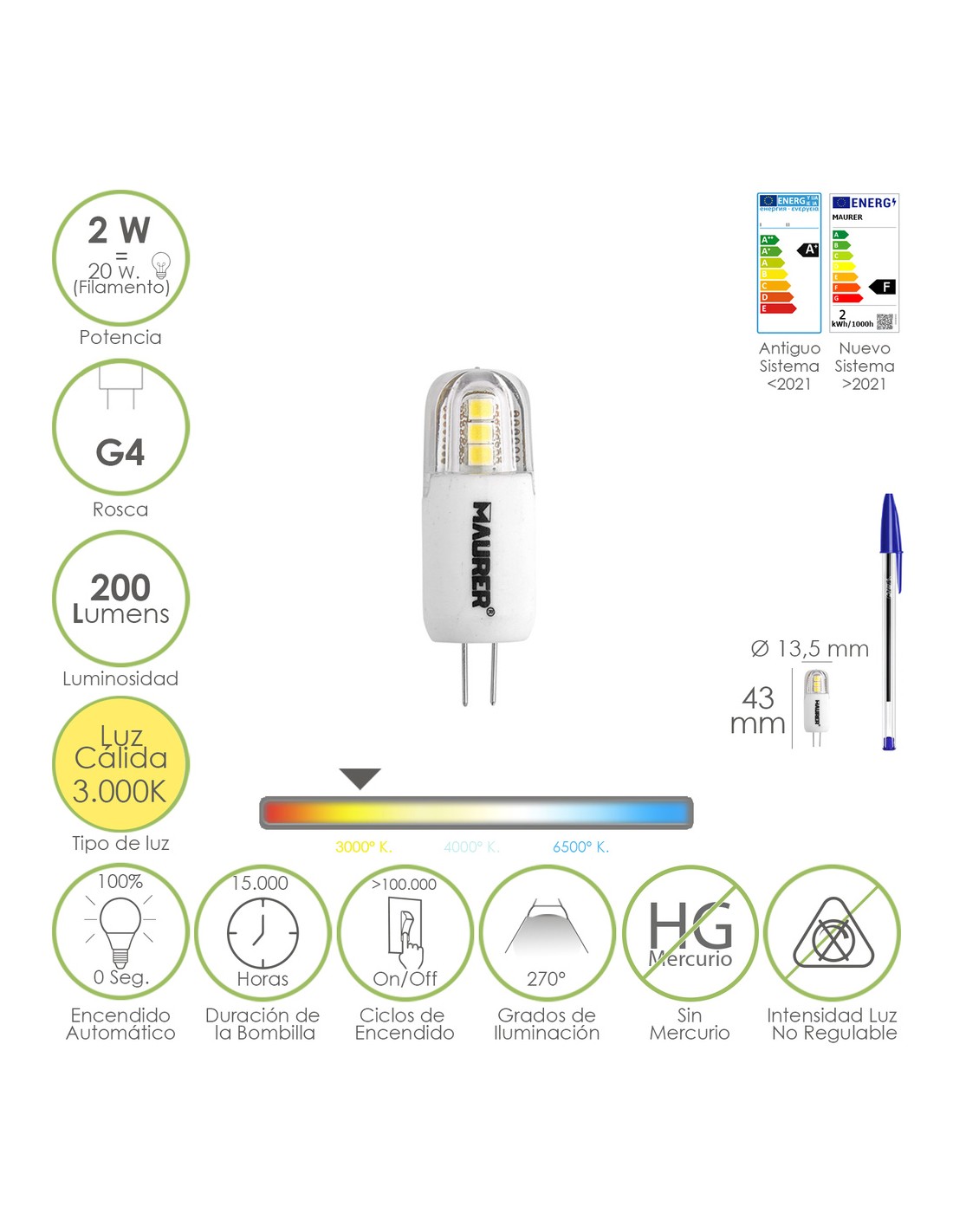 - Potencia: 2 W. equivalente a 20 W. aproximadamente de antigua incandescencia.