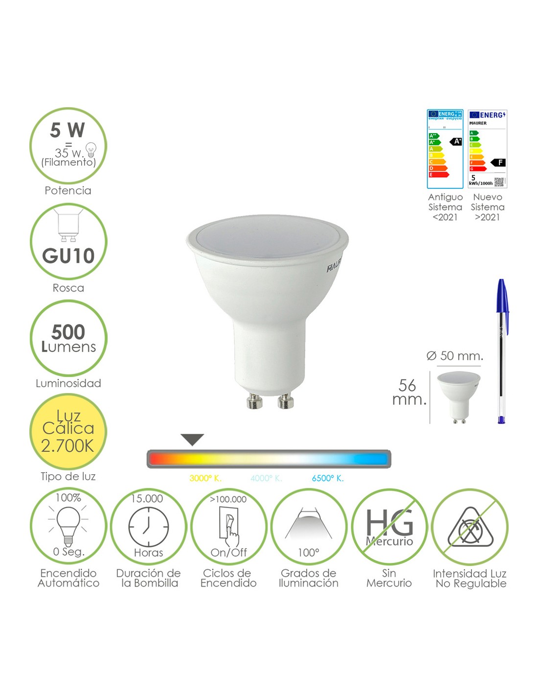- Potencia: 5 W. equivalente a 30 W. aproximadamente de antigua incandescencia.