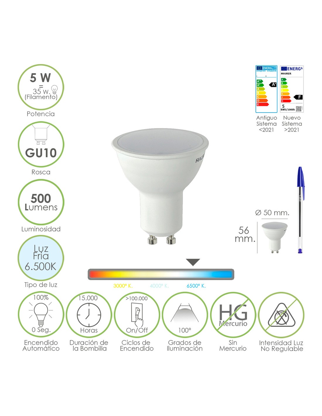 Bombilla Led Dicroica Rosca GU10. 5 Watt. Equivale A 30 Watt. 500 Lumenes. Luz Fria (6500º K.)