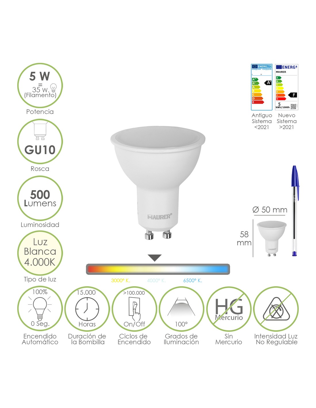 Bombilla Led Dicroica Rosca GU10. 5 Watt. Equivale A 35 Watt. 500 Lumenes. Luz Neutra 4000º K