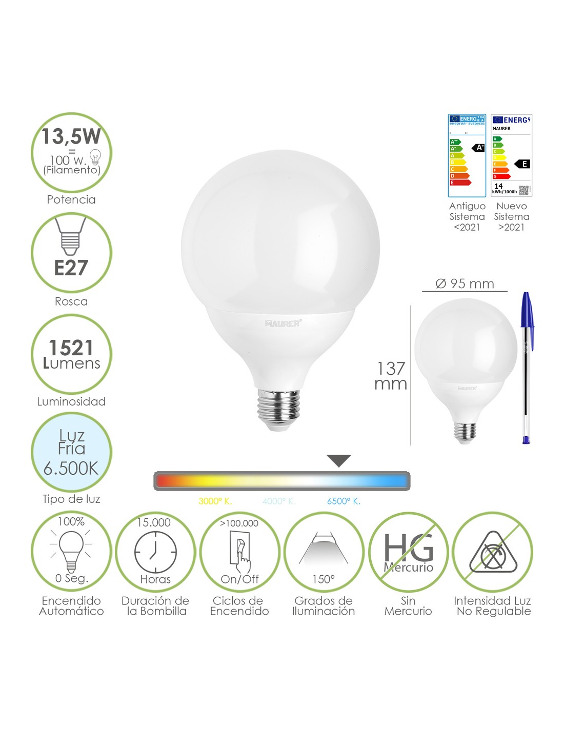 Bombilla Led Esfera Globo E27. 13,5 Watt. Equivale A 100 Watt. 1521 Lumenes. Luz Fria 6500º K.
