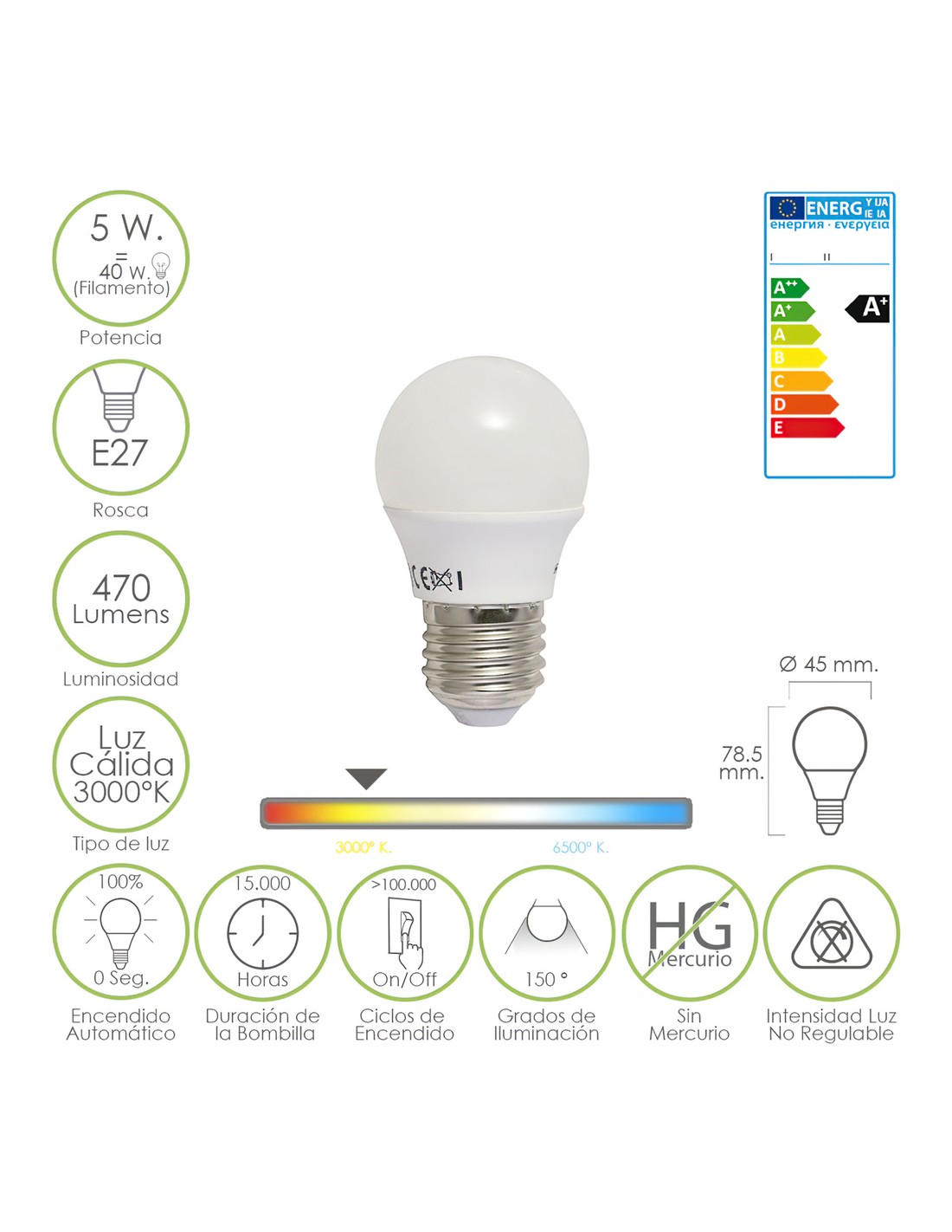 Bombilla Led Esferica E27 5 W. - 40 W. 470 lúmenes. Luz cálida (3.000 °K).