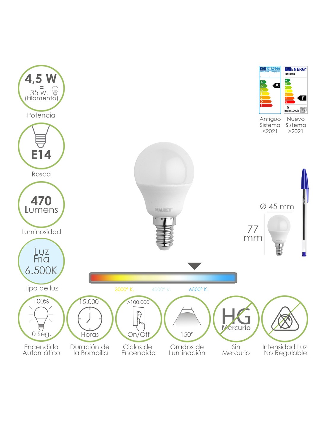 - Potencia: 4.5 W. equivalente a 35 W. aproximadamente de antigua incandescencia.