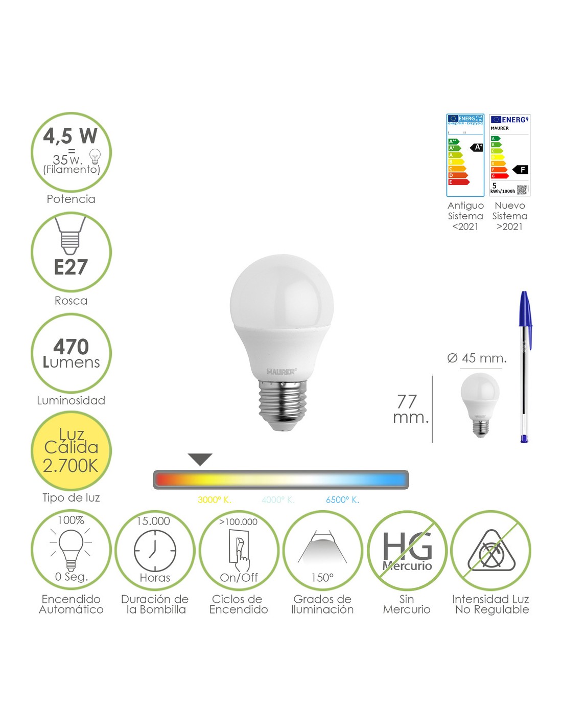 - Rosca: E-27. Potencia: 4.5 W. equivalente a 55 W. aproximadamente de antigua incandescencia.