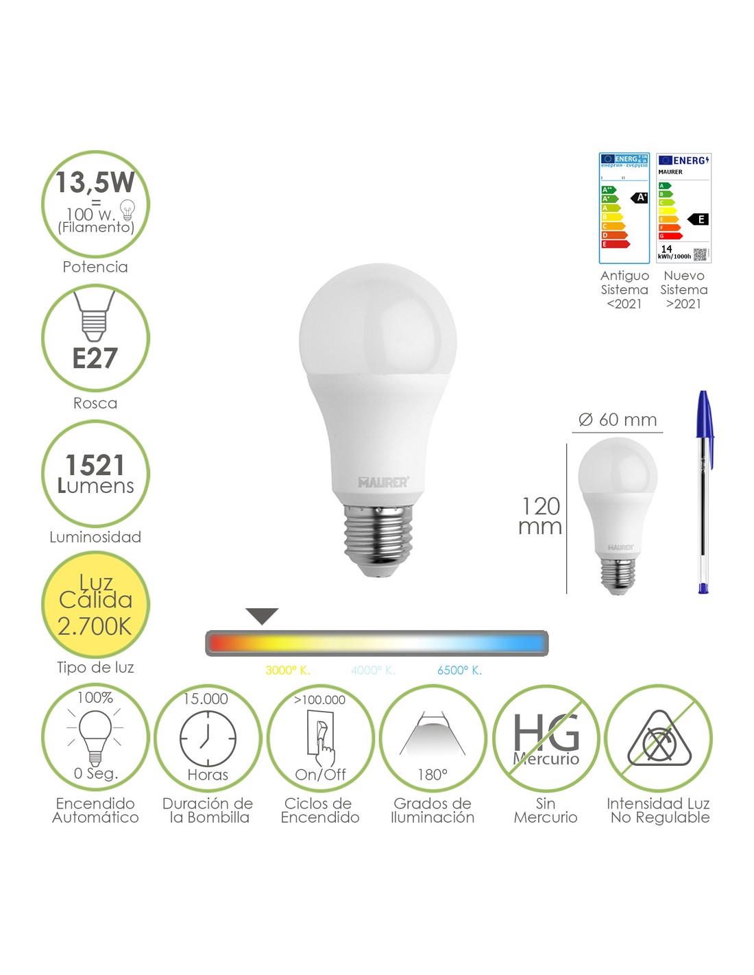 - Potencia: 13,5 W. equivalente a 100 W. aproximadamente de antigua incandescencia.