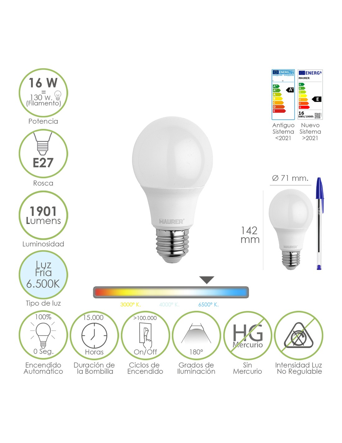 - Potencia: 16 W. equivalente a 130 W. aproximadamente de antigua incandescencia.