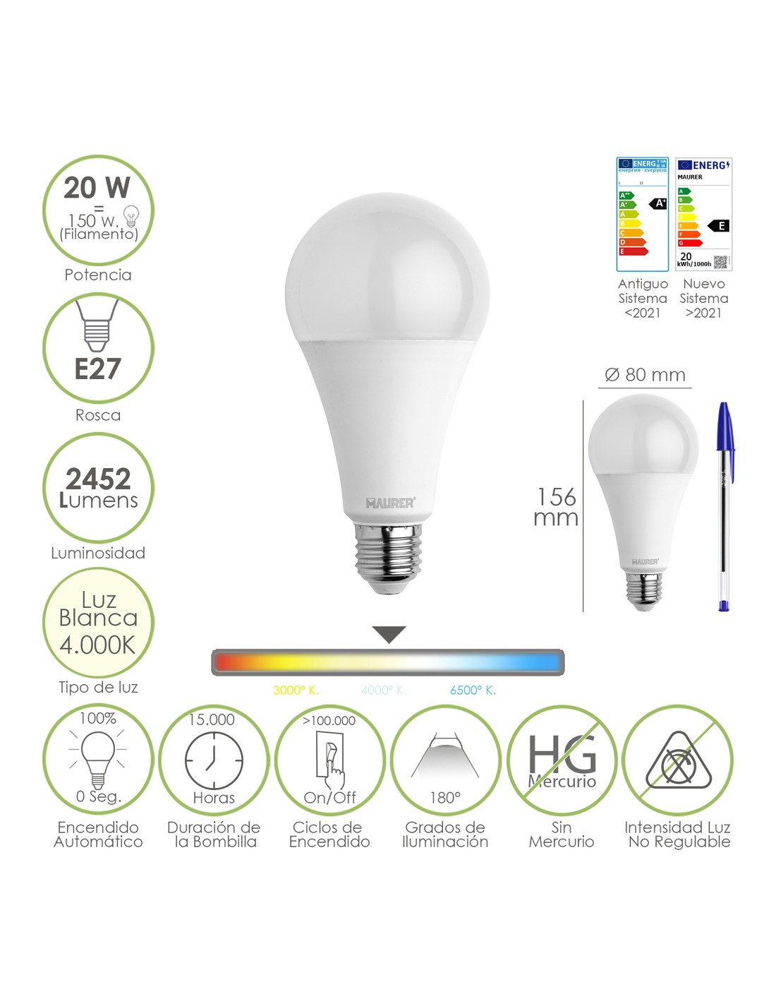 - Potencia: 20 W. equivalente a 150 W. aproximadamente de antigua incandescencia.