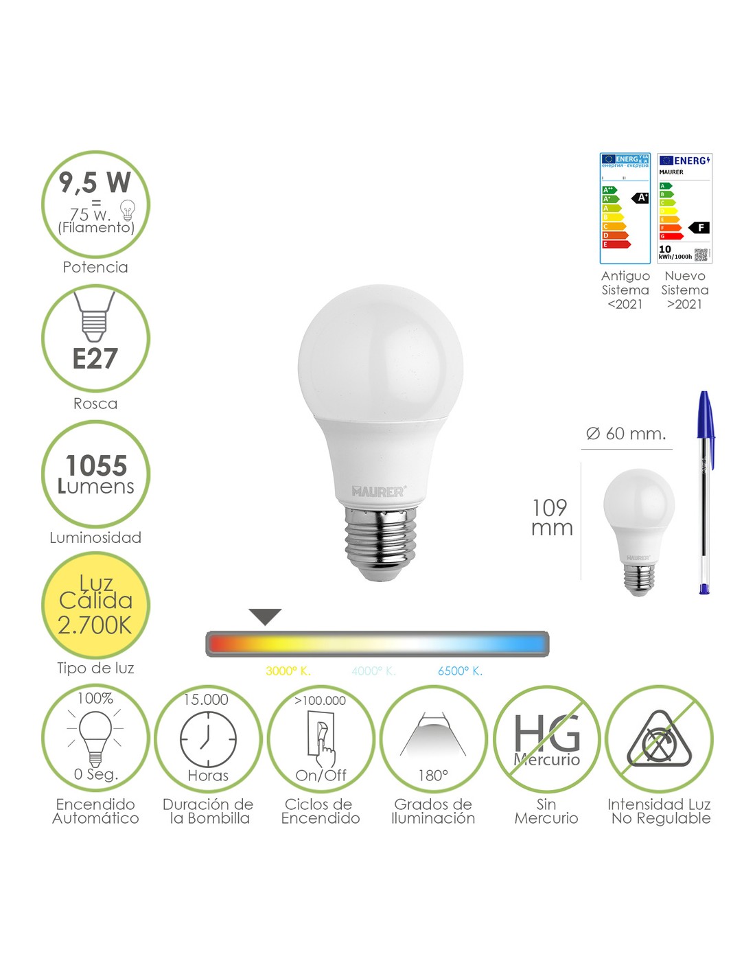 - Potencia: 9,5 W. equivalente a 75 W. aproximadamente de antigua incandescencia.