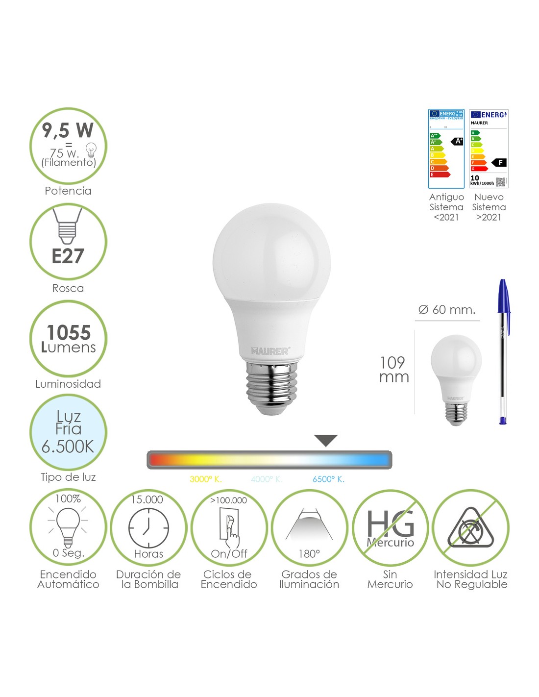 Bombilla Led Estandar Rosca E27. 9.5 Watt. Equivale A 75 Watt. 1055 Lumenes. Luz Fría (6500º K.)