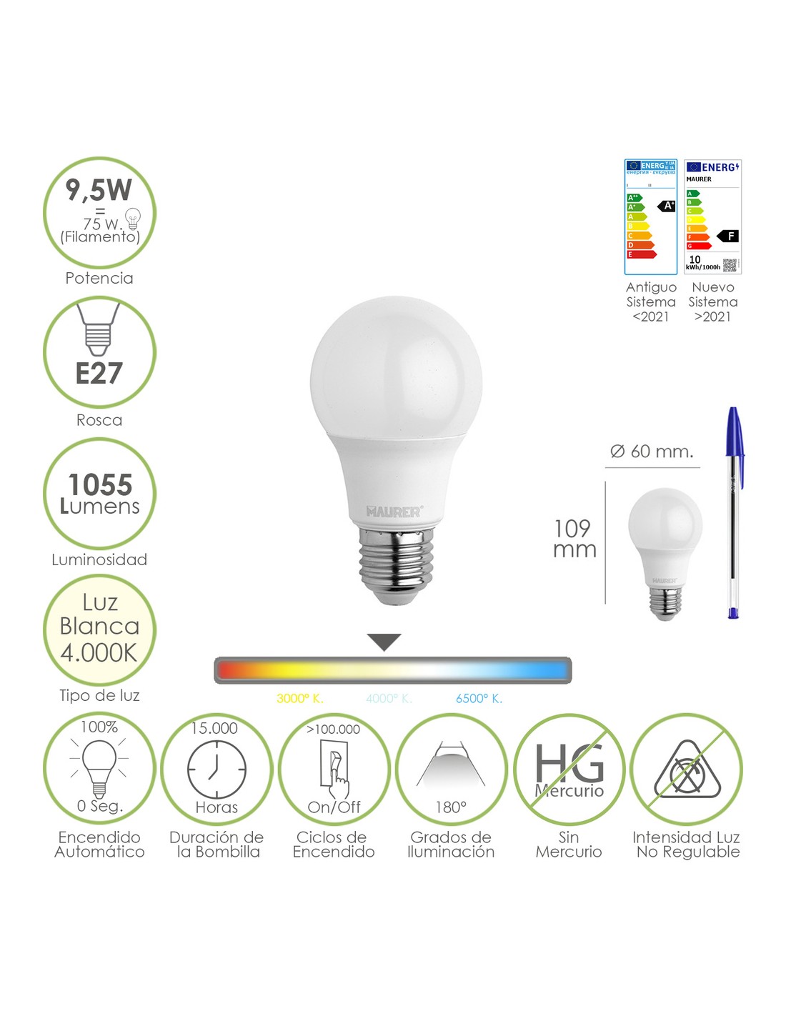 - Potencia: 9,5 W. equivalente a 75 W. aproximadamente de antigua incandescencia.