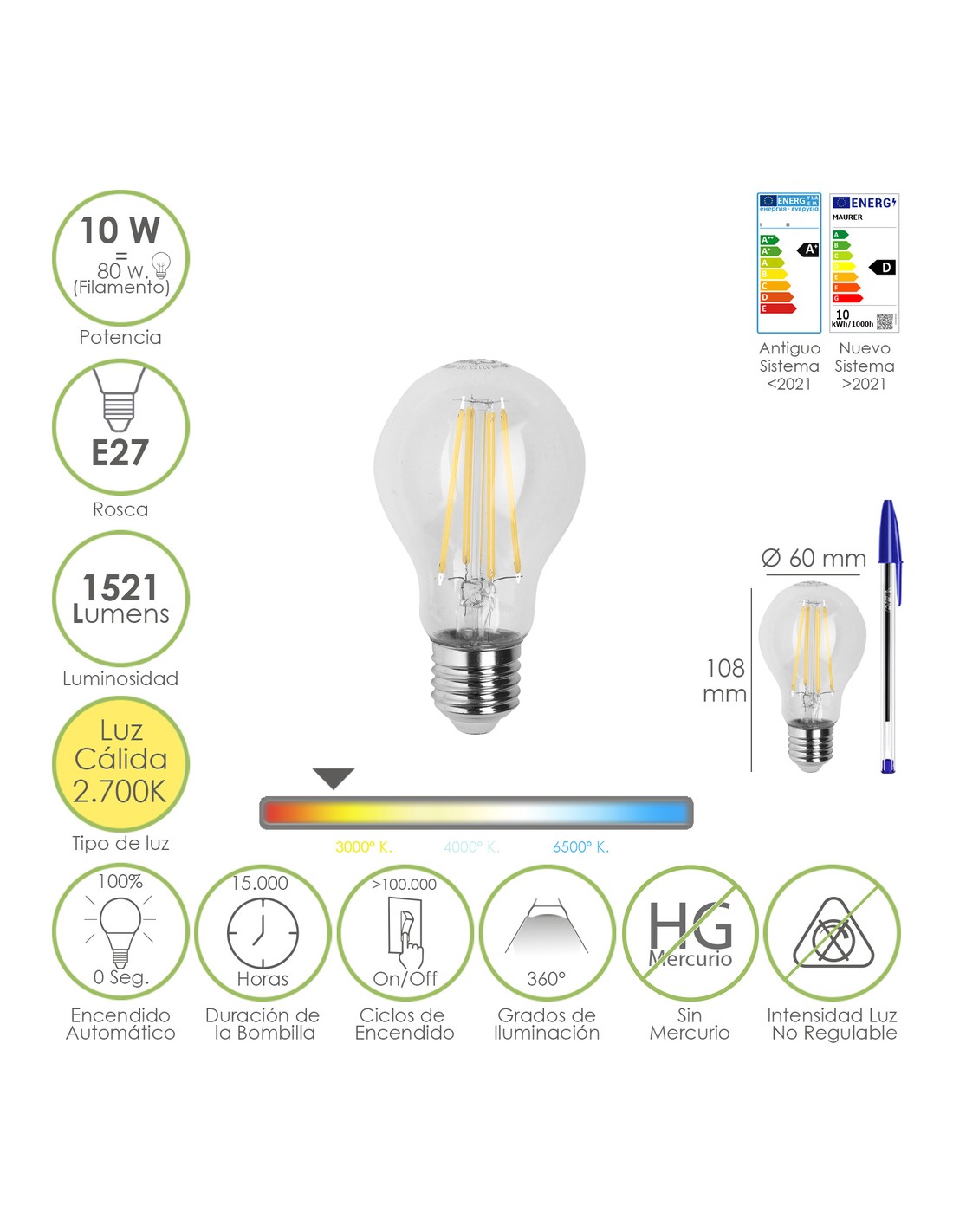 - Vida de la bombilla 15.000 horas.