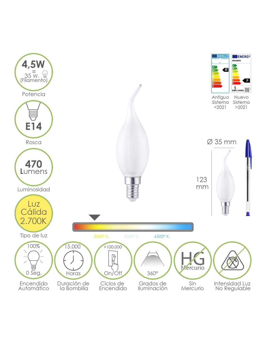 Bombilla Led Filamento Vela Llama Esmerilada E14. 4,5 Watt. Equivale A 35 Watt. 470 Lumenes. Luz Calida 2700º K.