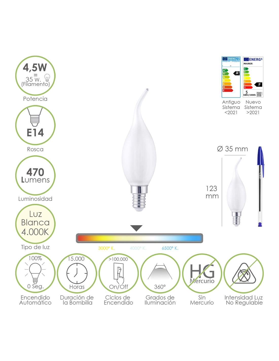 - Potencia: 4.5 W. equivalente a 35 W. aproximadamente de antigua incandescencia.