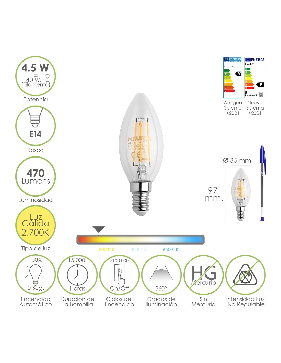 Bombilla Led Filamento Vela Rosca E14. 4,5 Watt. Equivale A 40 Watt. 470 Lumenes. Luz Cálida (2700º K.)