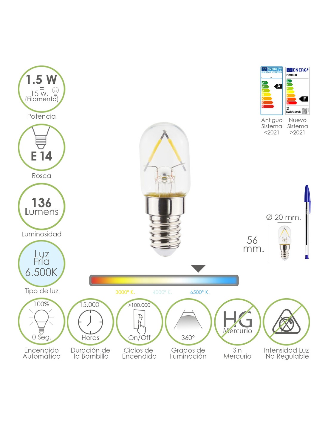 Bombilla Led Frigorifico Rosca E14. 1.5 Watt. Equivale A 15 Watt. 136 Lumenes. Luz Fria (6500º K.)