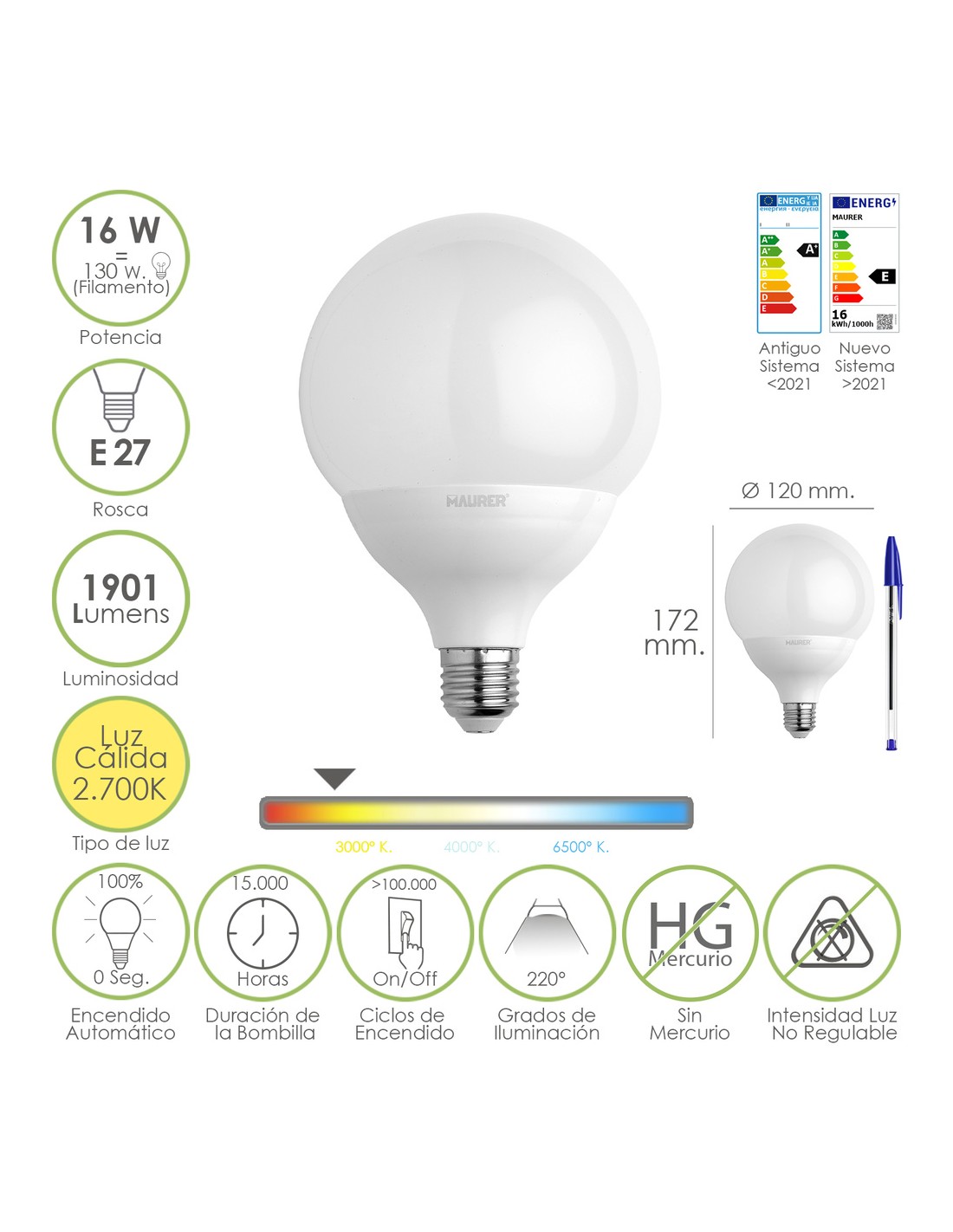 - Potencia: 16 W. equivalente a 130 W. aproximadamente de antigua incandescencia.