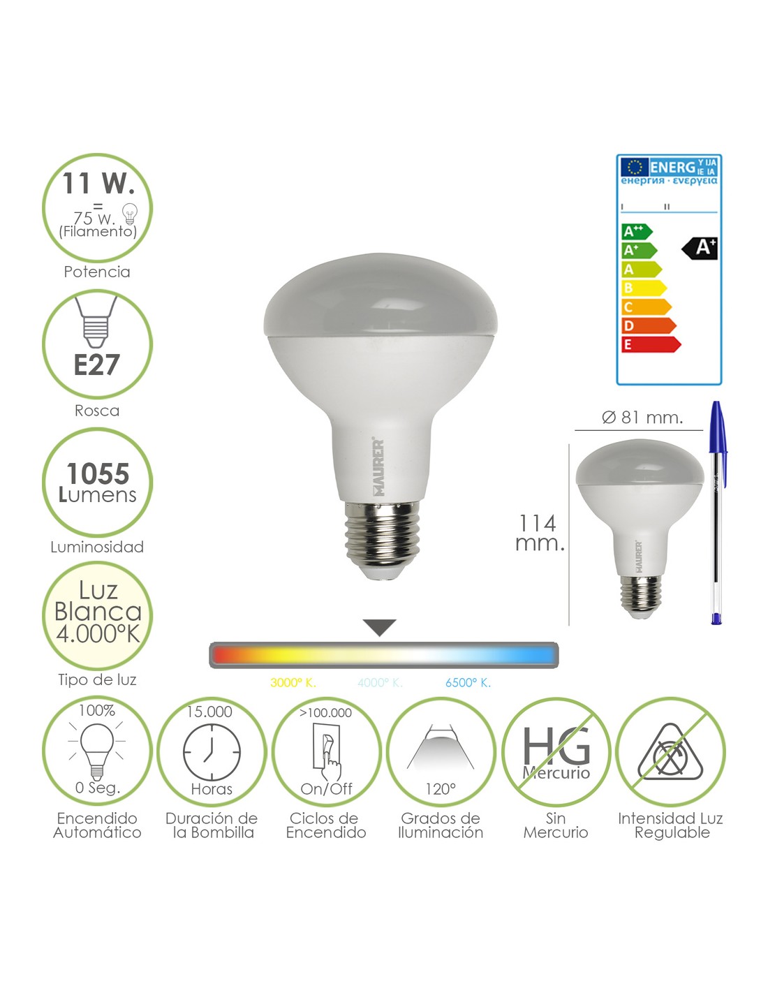 - Potencia: 11 W. equivalente a 75 W. aproximadamente de antigua incandescencia.