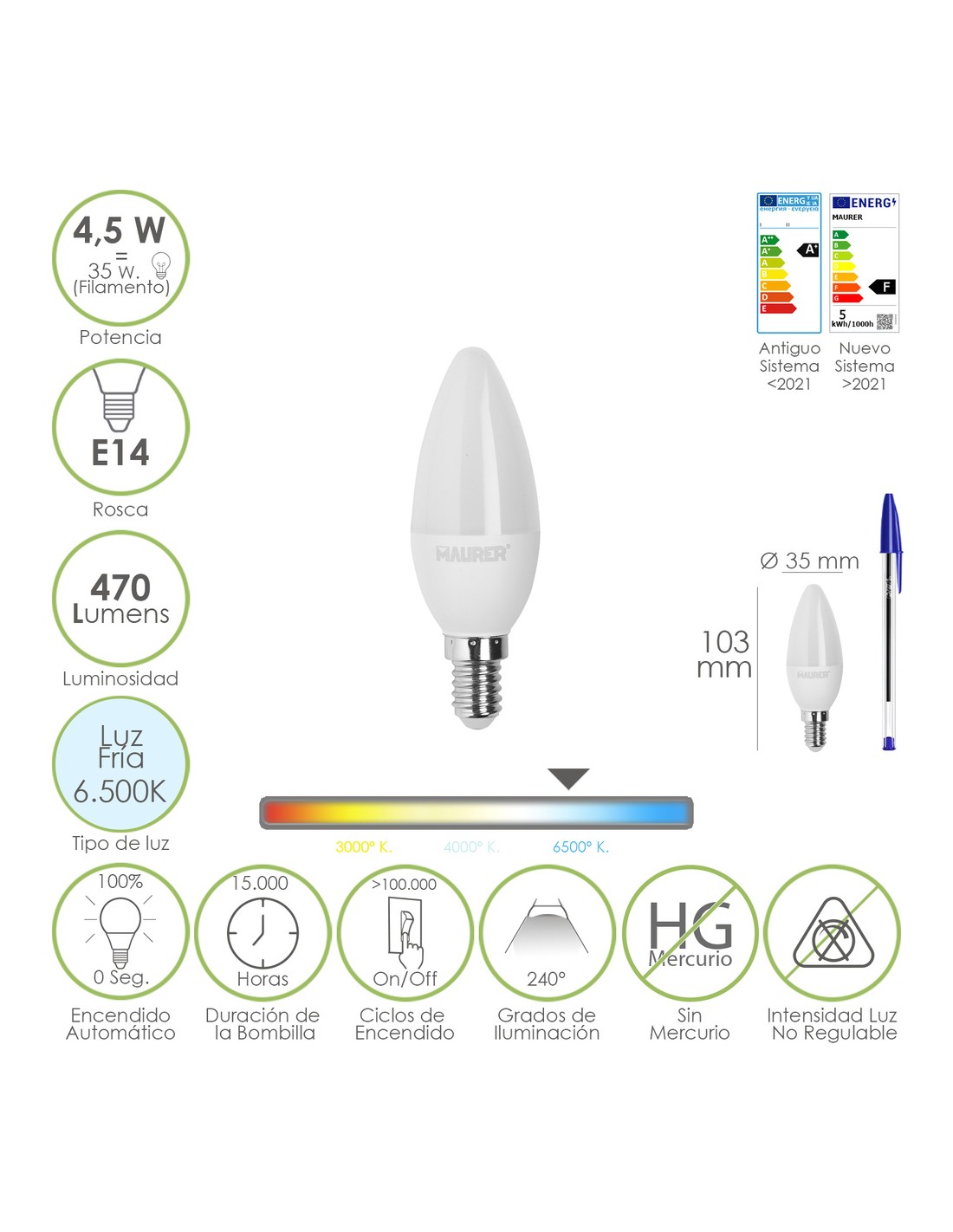 - Potencia: 4,5 W. equivalente a 35 W. aproximadamente de antigua incandescencia.