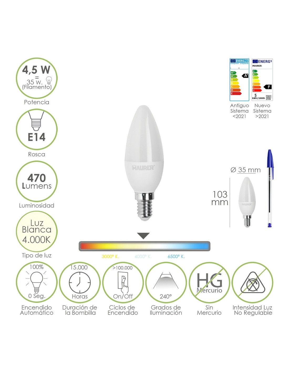 - Potencia: 4,5 W. equivalente a 35 W. aproximadamente de antigua incandescencia.