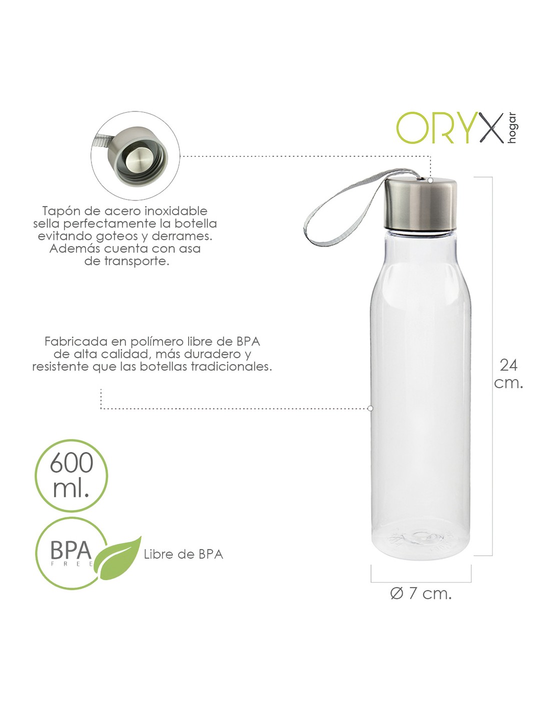 Botella Agua, Capacidad De 600 ML. Plastico Libre BPA, Con Asa, Tapon Acero Inoxidable.
