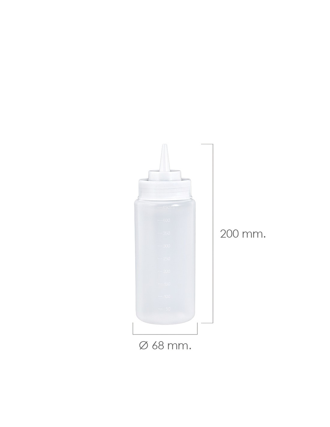 Botella biberon - Medida: Ø 6.8 x 20 cm. - Capacidad: 500 ml - Con cierre a rosca. - Realizado en plastico. - Con escalas de capacidad. - Ideal para salsas, aceites, vinagres, vinagretas, mahonesa, ketchup, etc.