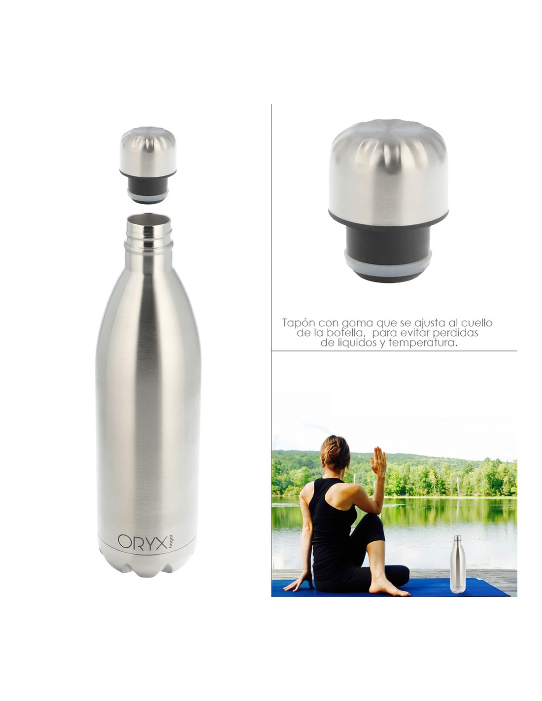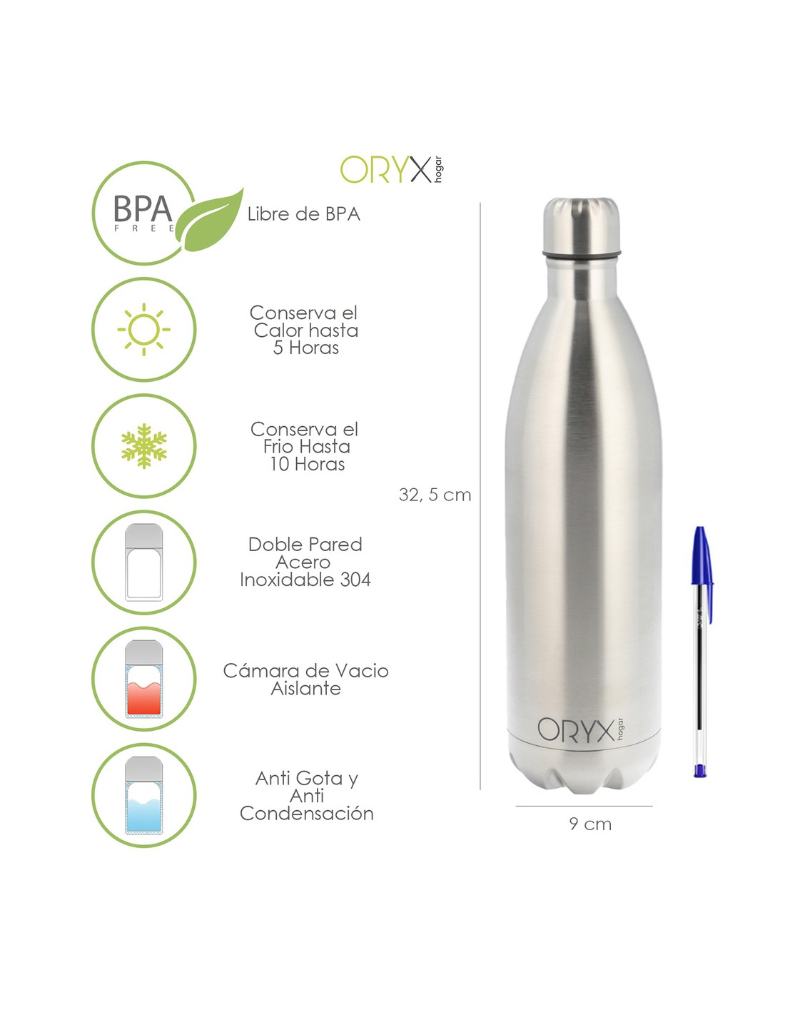 - Botella térmica de doble pared, se mantiene fría al tacto con líquidos calientes y no produce condensación exterior con bebidas frías. No produce gotas. La temperatura exterior no afecta al interior y viceversa.