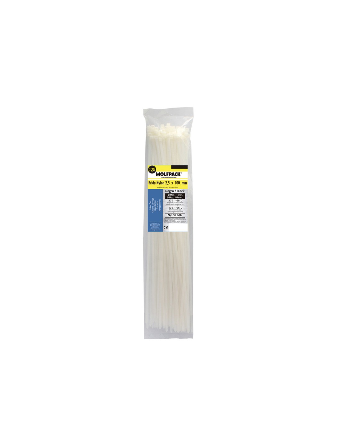 Brida Nylon 100%. Color Blanco / Natural 2,5 x 100 mm. 100 Piezas. Abrazadera Plastico, Organizador Cables, Alta Resistencia
