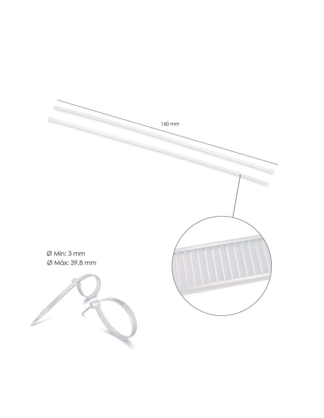 Brida Nylon 100%. Color Blanco / Natural 2,5 x 160 mm. 100 Piezas. Abrazadera Plastico, Organizador Cables, Alta Resistencia